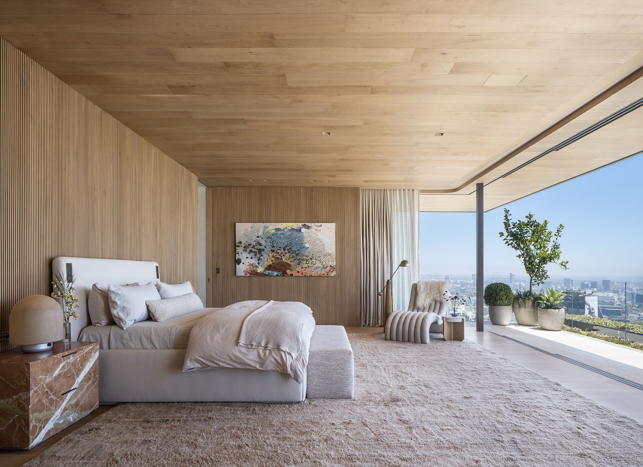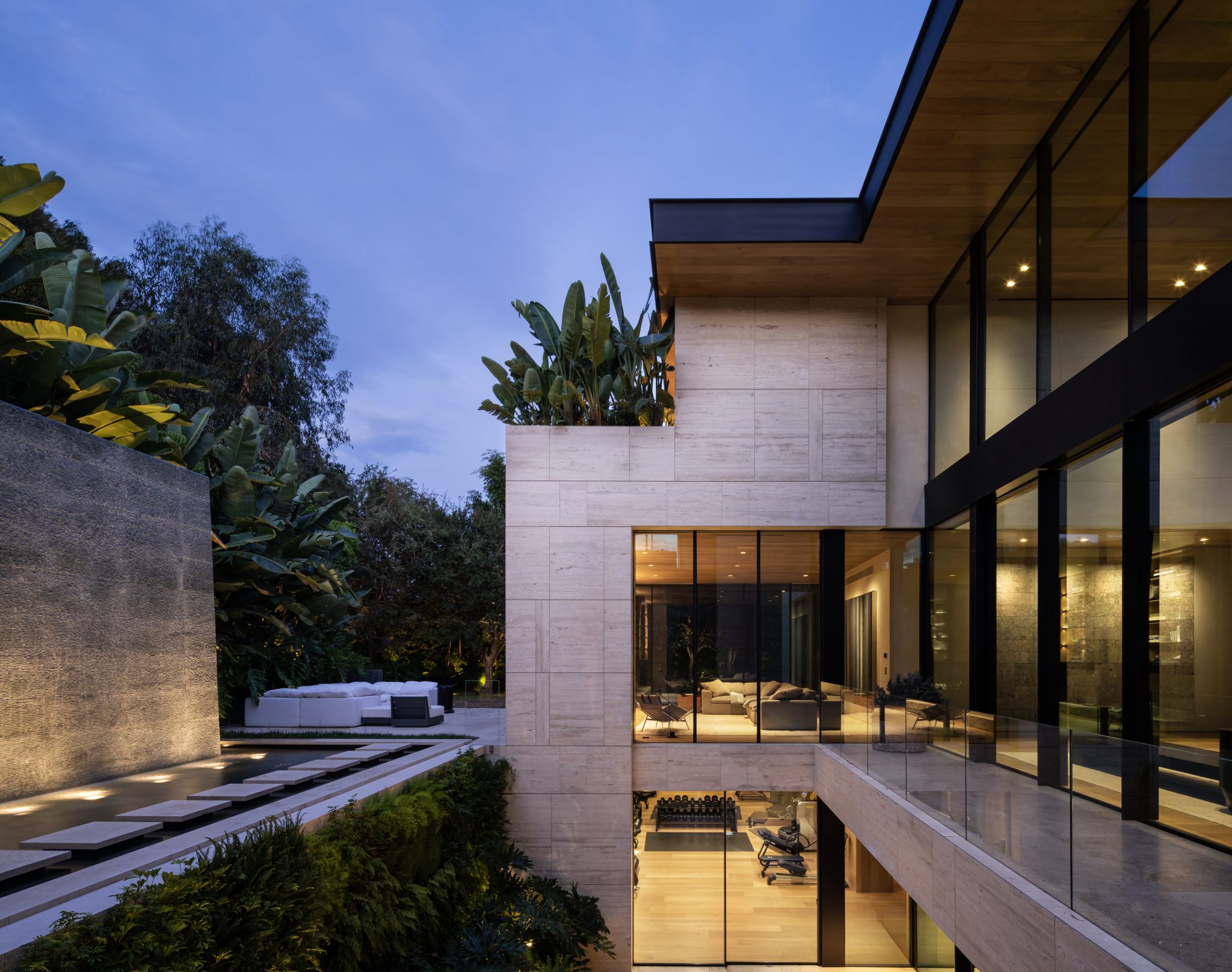 Throughout, a refined material palette of warm travertine, bleached walnut, and hand-patinated metal unifies the architecture. Travertine is detailed in multiple expressions, shifting with each programmatic need. The home's large scale is tempered by these natural materials, rigorous detailing, and an immersive landscape that frames every interior view.