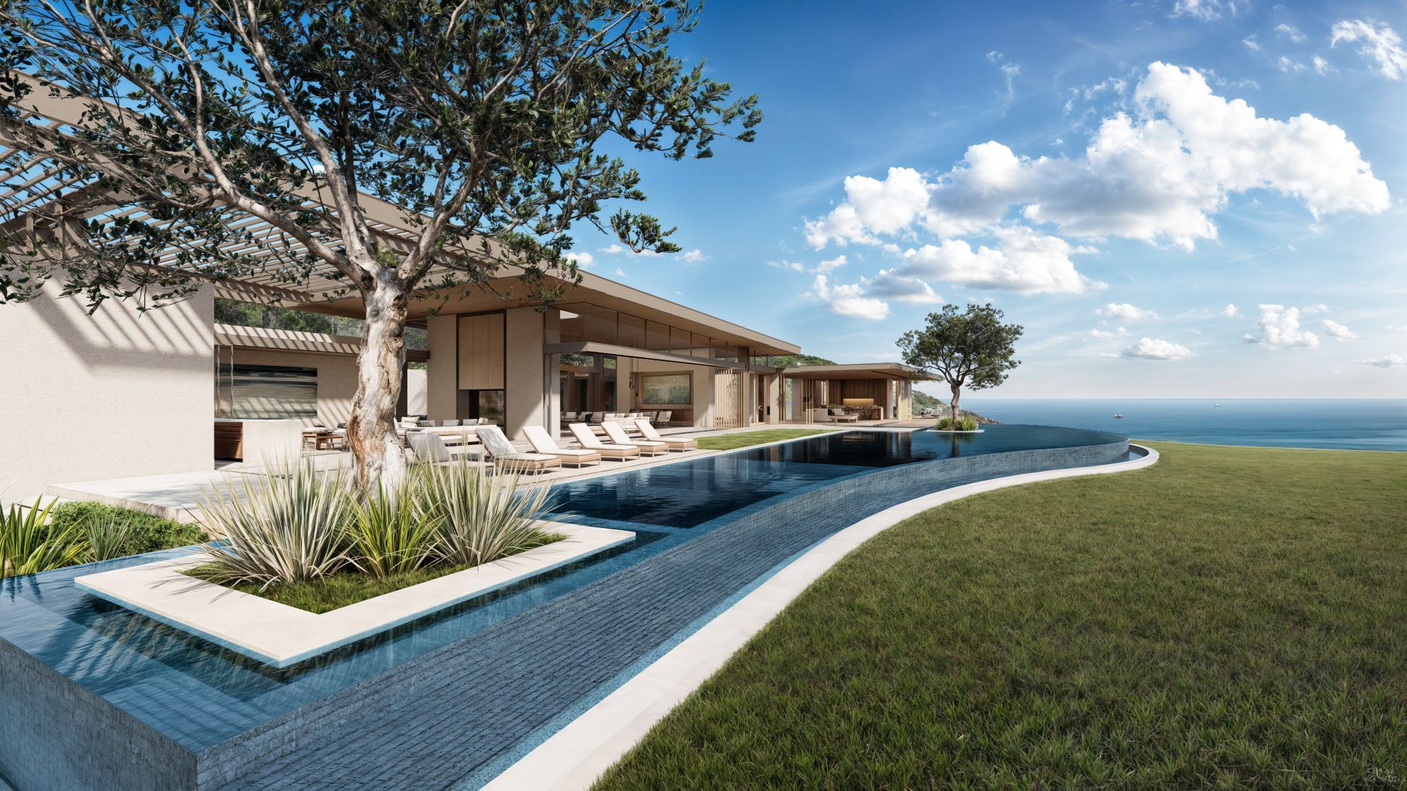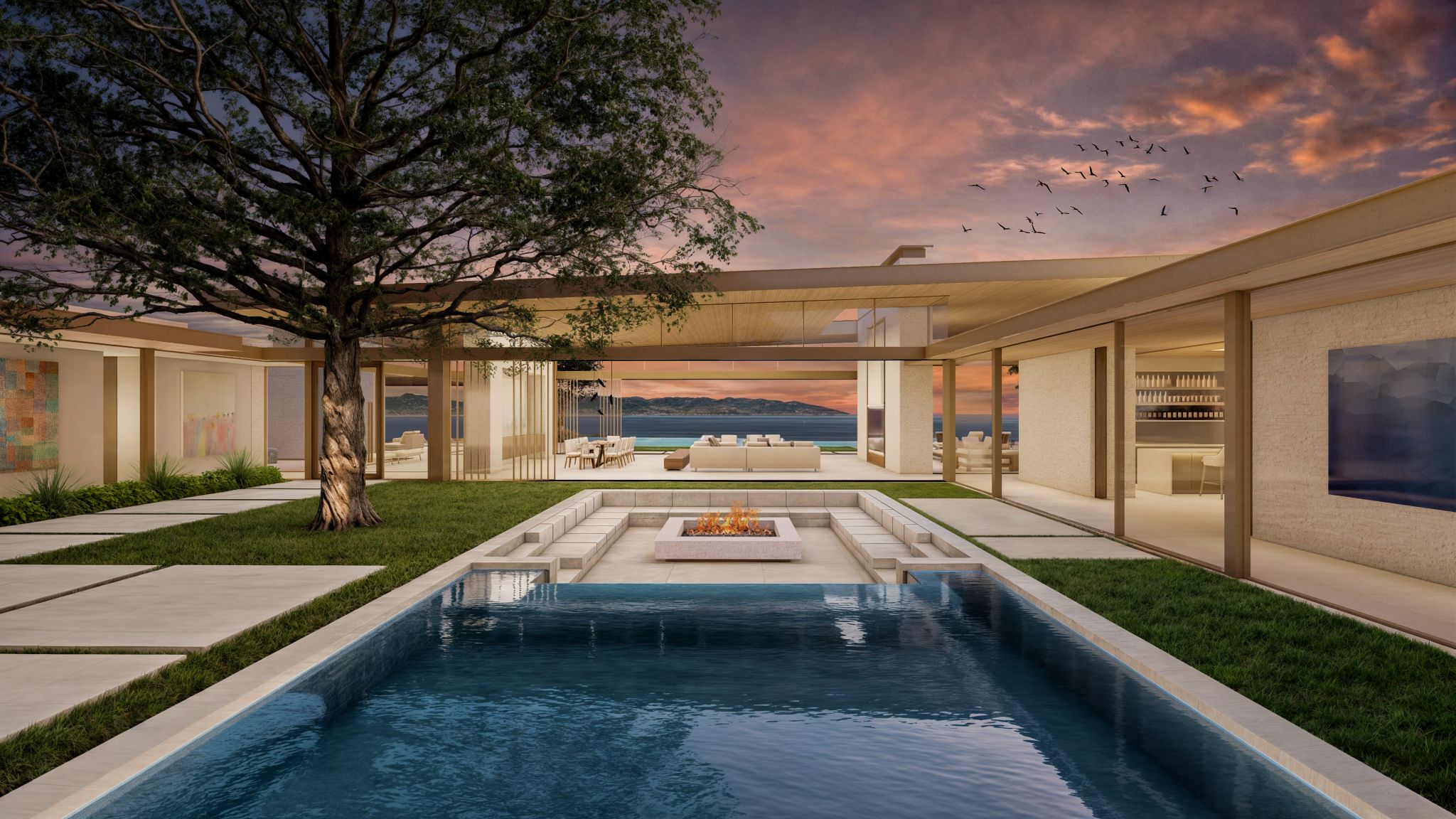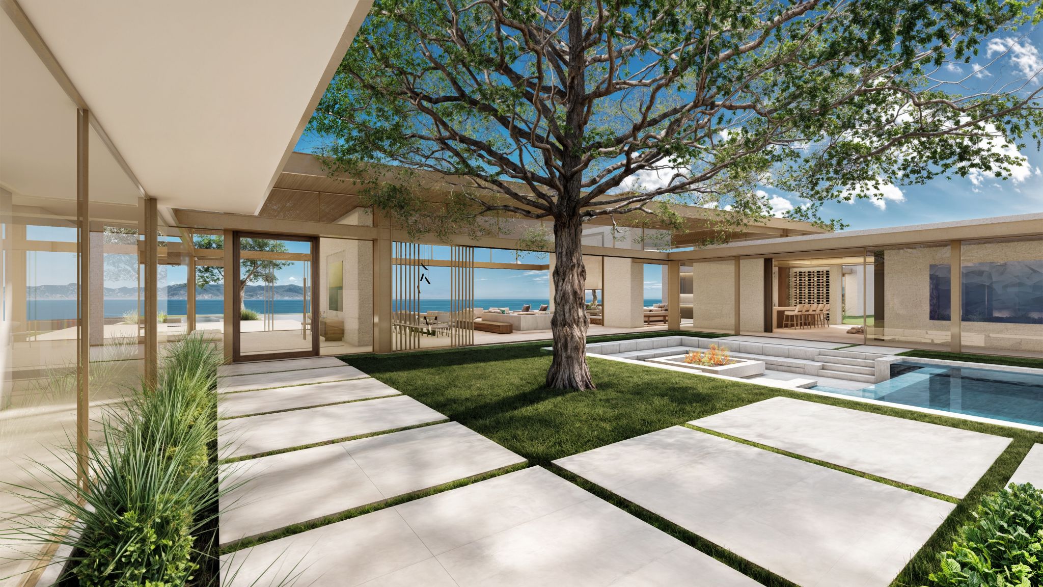 Each space within the home opens directly to outdoor terraces with unobstructed views. The main living space connects directly to the pool terrace with full height glazing that pockets into adjacent walls to create a seamless blend of indoor-outdoor living, while the pool itself contains planted islands with trees that frame the sunset. The estate also contains a wellness retreat, guest house, underground parking garage cars as well as a helicopter landing pad.