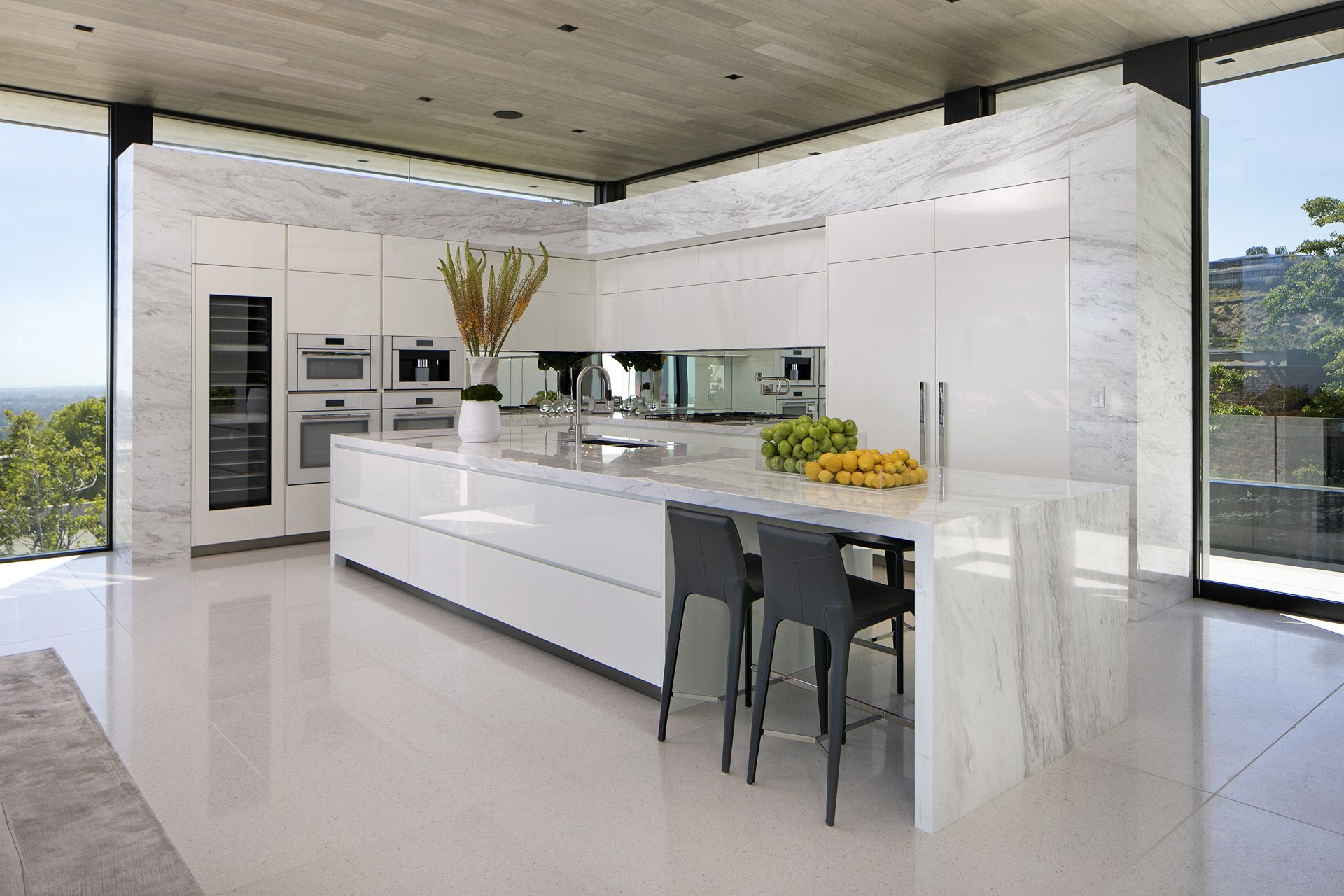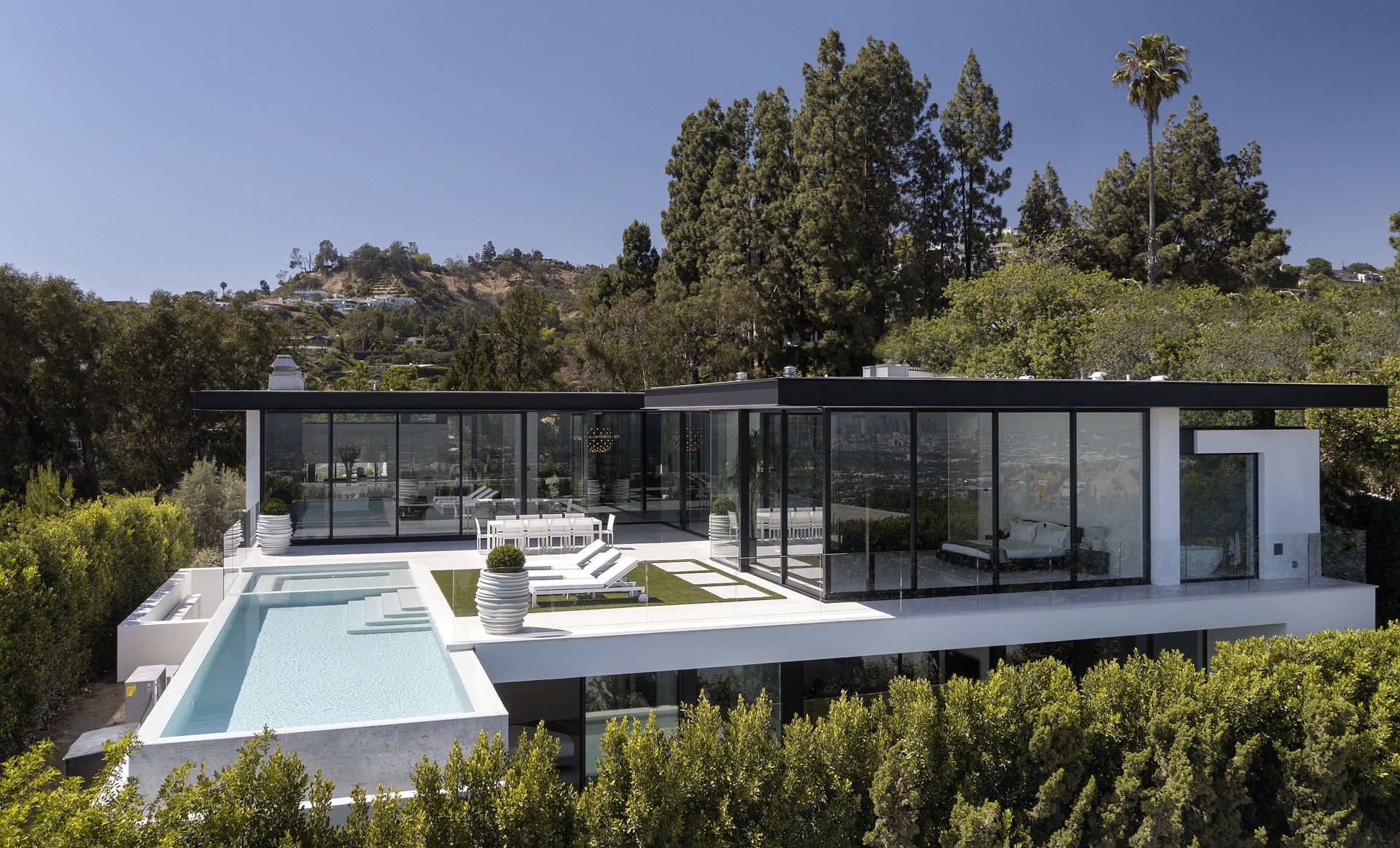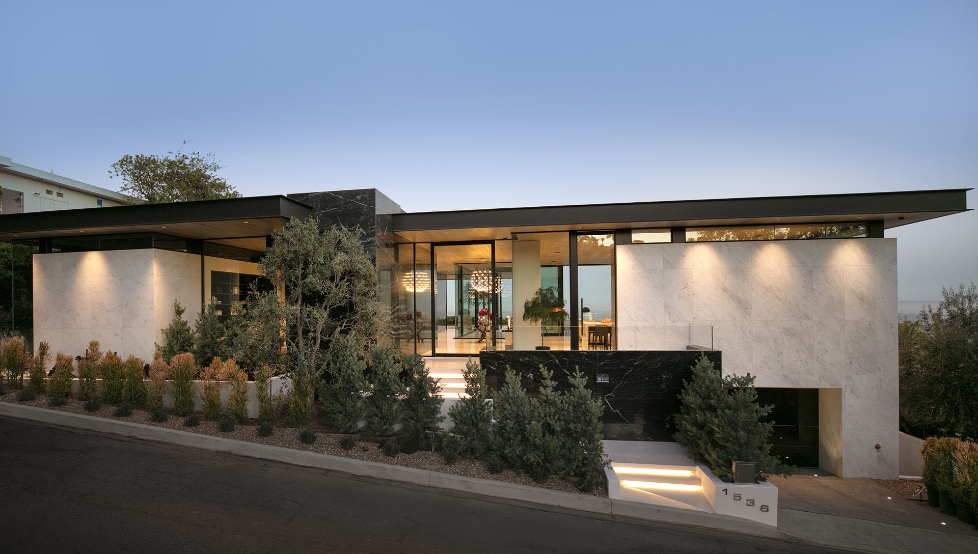 This house is located on a hillside lot in the bird streets of Los Angeles with panoramic views stretching from downtown Los Angeles to the ocean. With a quarter acre of land, 18’ height limit and limited frontage, the challenge was to obscure the parking and garage entry while maintaining a strong street presence. The slope of the street allowed for a basement garage entry to the south and a comfortable semi-private path from the street to the front door. A continuous flat roof separates itself from the exterior walls giving the house a feeling of lightness as light and warm wood ceilings seep from inside to out. Upon entry, the axial view to downtown LA reveals itself amid the primary living spaces. The dining room to the left is flanked by matching fireplaces with an exterior water wall that ripples sunlight back into the dining room. To the right is the open plan kitchen and living room which flows to the backyard as multi-slide panels stack to the side. Nestled to the rear of the main level is the master suite with arguably the best views in the house as the bedroom exits to the pool. His and her bathrooms and closets are situated behind the bedroom and separated with a sky-lit vestibule.