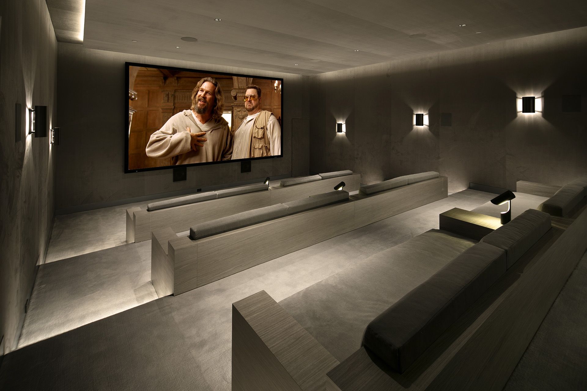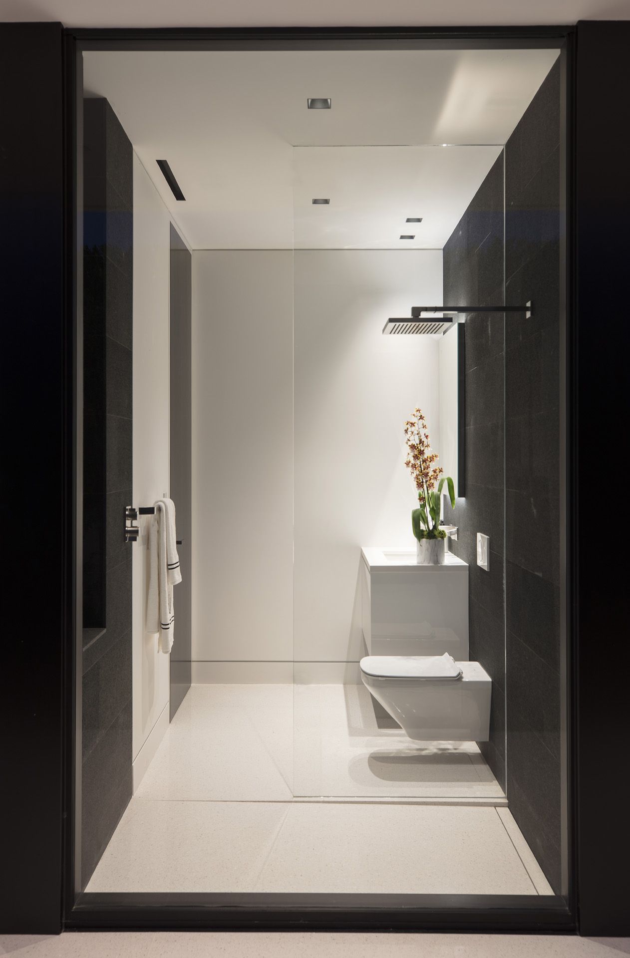 The basement level houses the 4-car garage, entertainment functions as well as 2 bedrooms and gym. The natural topography of the site allowed for the basement level to daylight at the back of the house. A large skylight over the floating tread stair and water feature lightwell cascade the basement with natural light. A large stadium seating media room is adjacent to the lounge and wine room and features candy drawers from wall to wall. Basement bedrooms exit to the backyard where the pool from the upper level spills into a plunge pool at the basement level