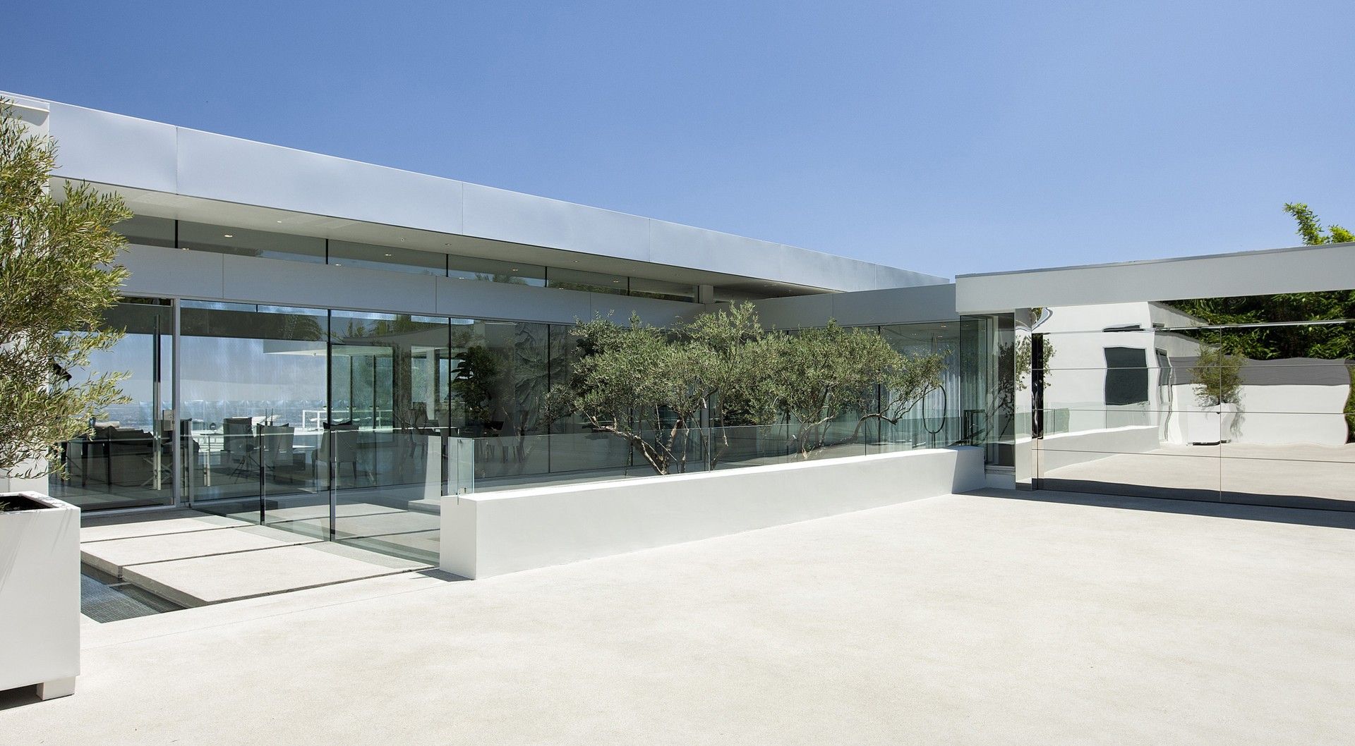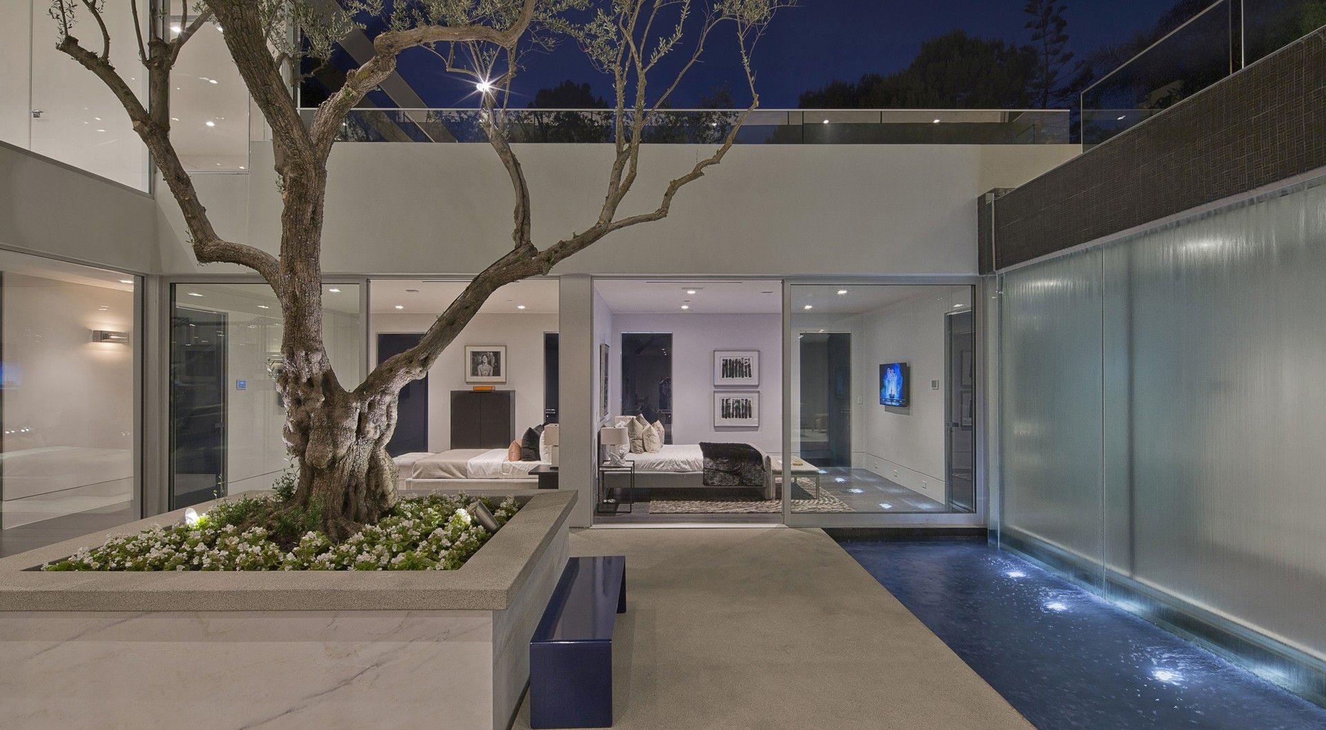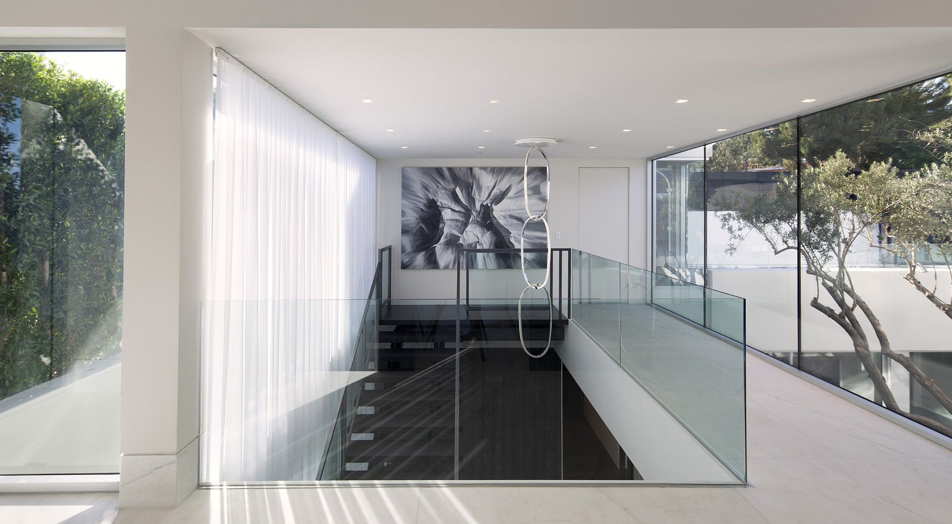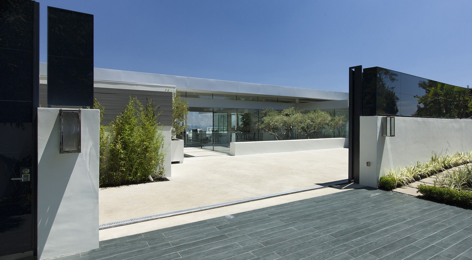 Located in the Trousdale neighborhood of Beverly Hills where all proposed work must take place without disturbing existing slopes, the challenge for this design is to find ways to create light for the lower level. Here we have created a light well which separates the drive court from the house itself and allows for an entrance across a water feature that cascades over glass to the atrium below. Landscaped with glass on four sides this allows light to the entertainment areas, gym and secondary bedrooms leaving more room upstairs for the rear yard and swimming pool. The upper level contains the master and two additional bedrooms, living room, family, dining and kitchen.
