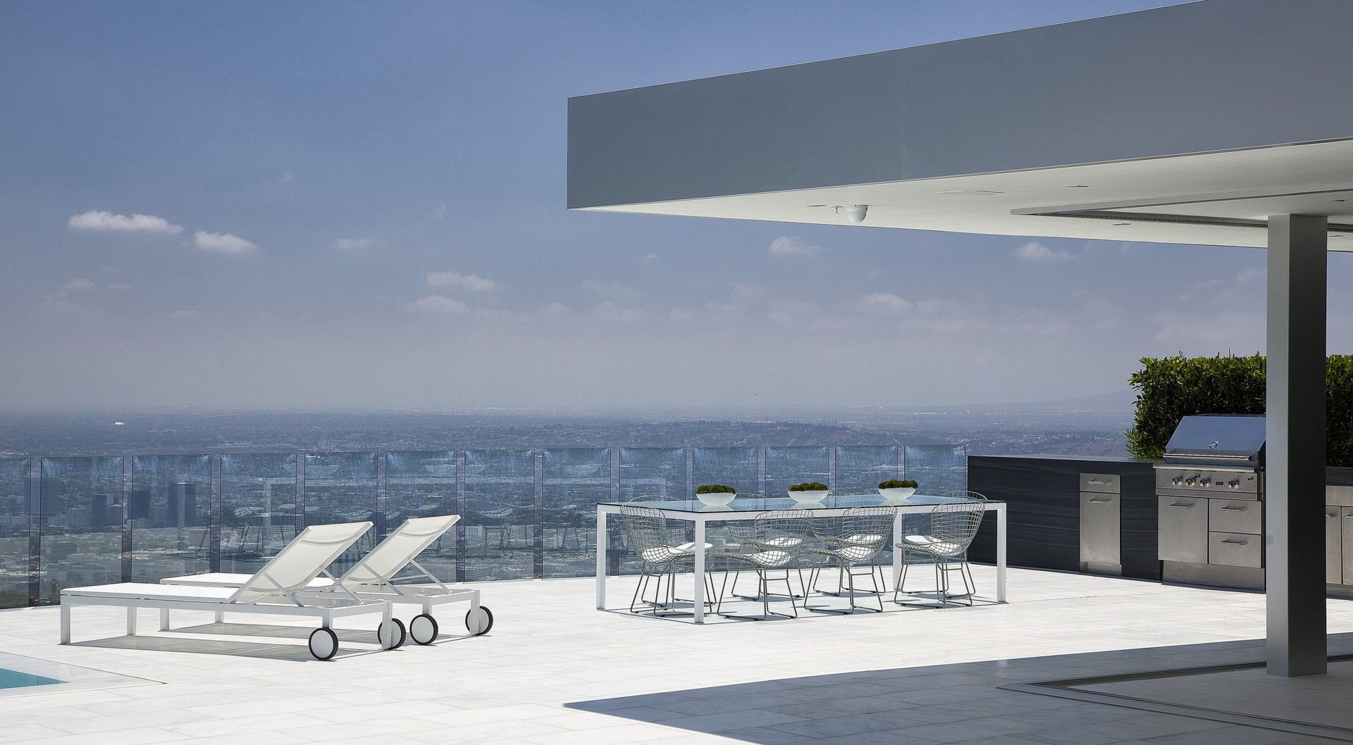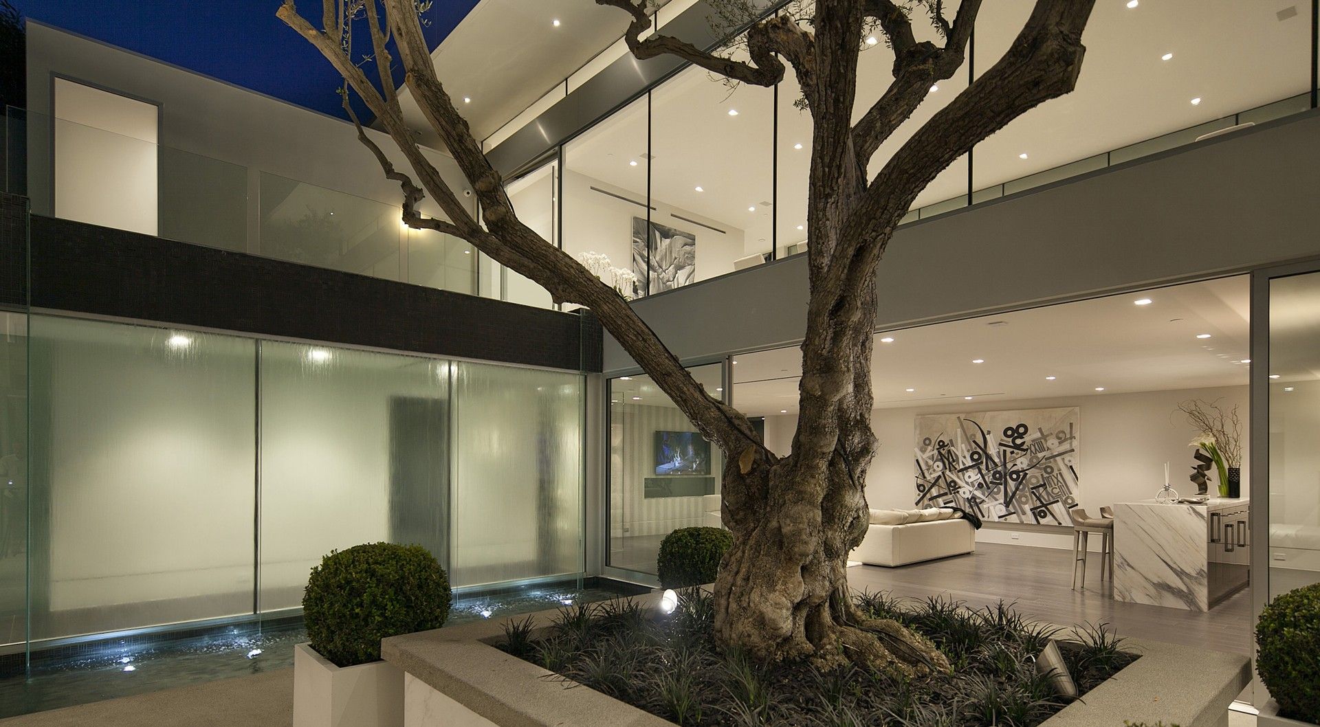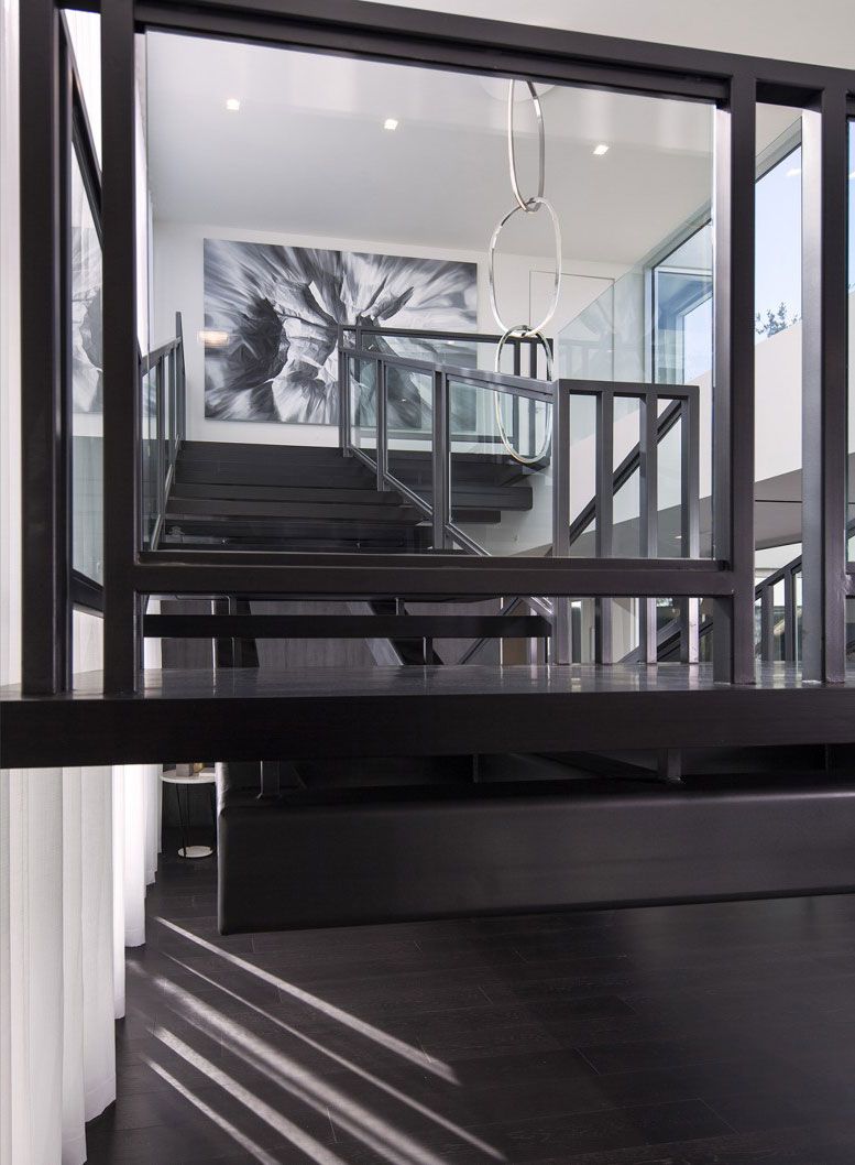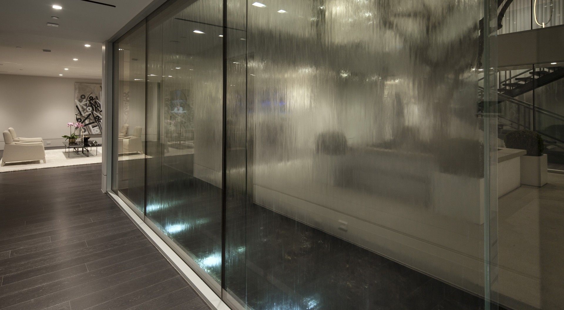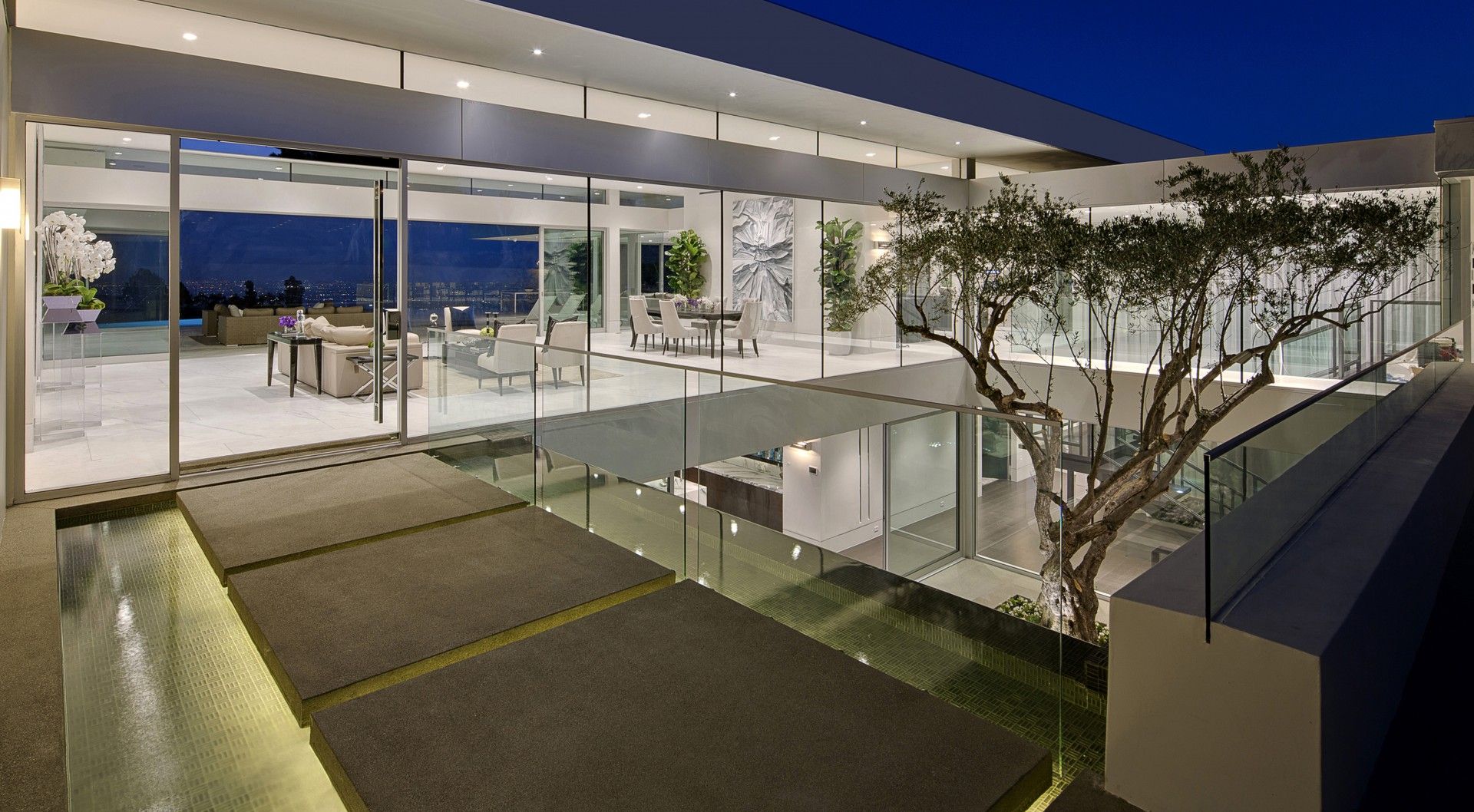 Located in the Trousdale neighborhood of Beverly Hills where all proposed work must take place without disturbing existing slopes, the challenge for this design is to find ways to create light for the lower level. Here we have created a light well which separates the drive court from the house itself and allows for an entrance across a water feature that cascades over glass to the atrium below. Landscaped with glass on four sides this allows light to the entertainment areas, gym and secondary bedrooms leaving more room upstairs for the rear yard and swimming pool. The upper level contains the master and two additional bedrooms, living room, family, dining and kitchen.