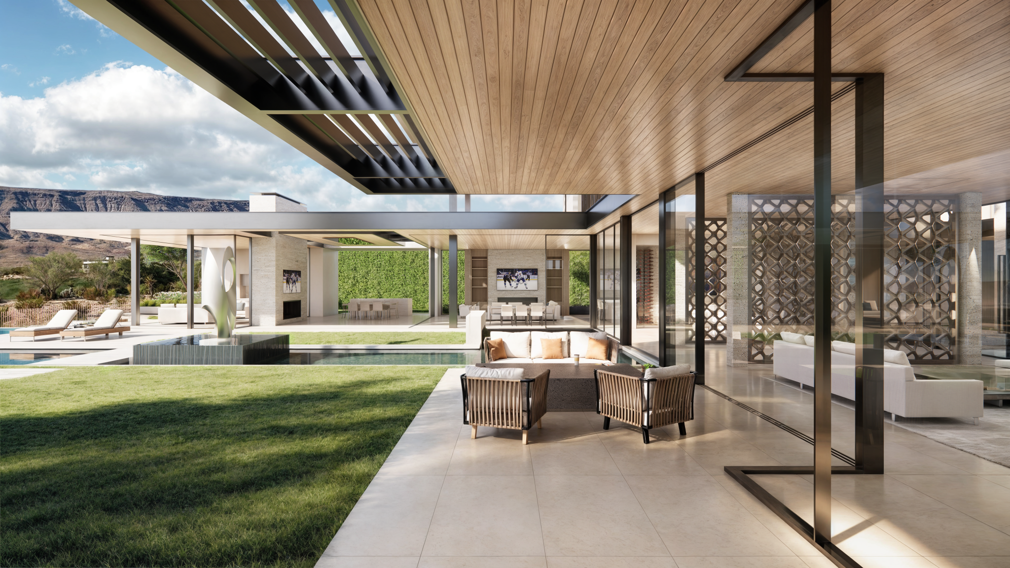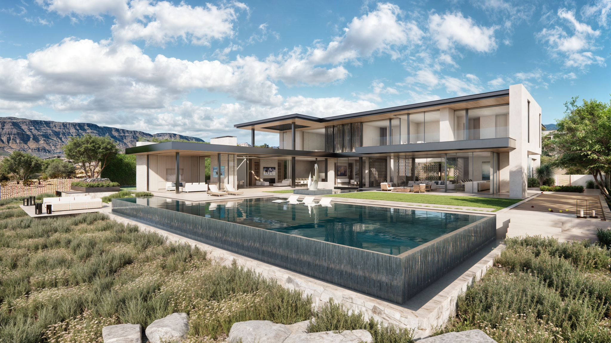 Located within the prestigious Summit Club community in Las Vegas, this home embraces the stunning desert landscape while offering a private and serene retreat focused on family living. Positioned on a coveted lot overlooking the golf course with views toward the Las Vegas Strip, the residence strives for indoor-outdoor living. The home is divided into three levels, each designed to balance privacy for family spaces with open, welcoming entertaining areas. The top floor features bedrooms and a family room showcasing expansive views of the surrounding landscape. The main level consists of the primary living spaces including the formal living room, kitchen and family areas as well as services spaces and a garage for day-to-day access. The main living spaces are designed to flow seamlessly into each other and open directly onto outdoor spaces.