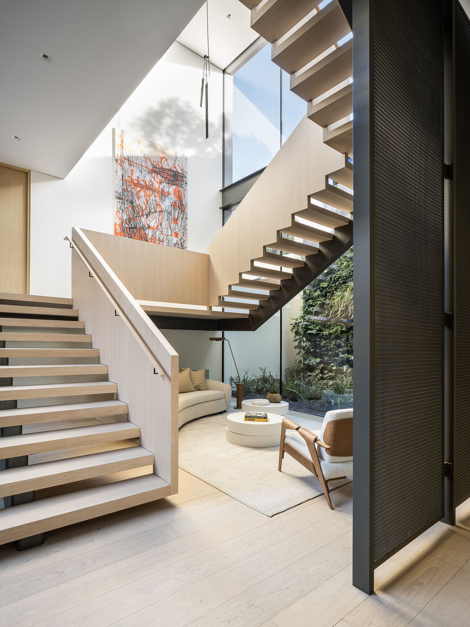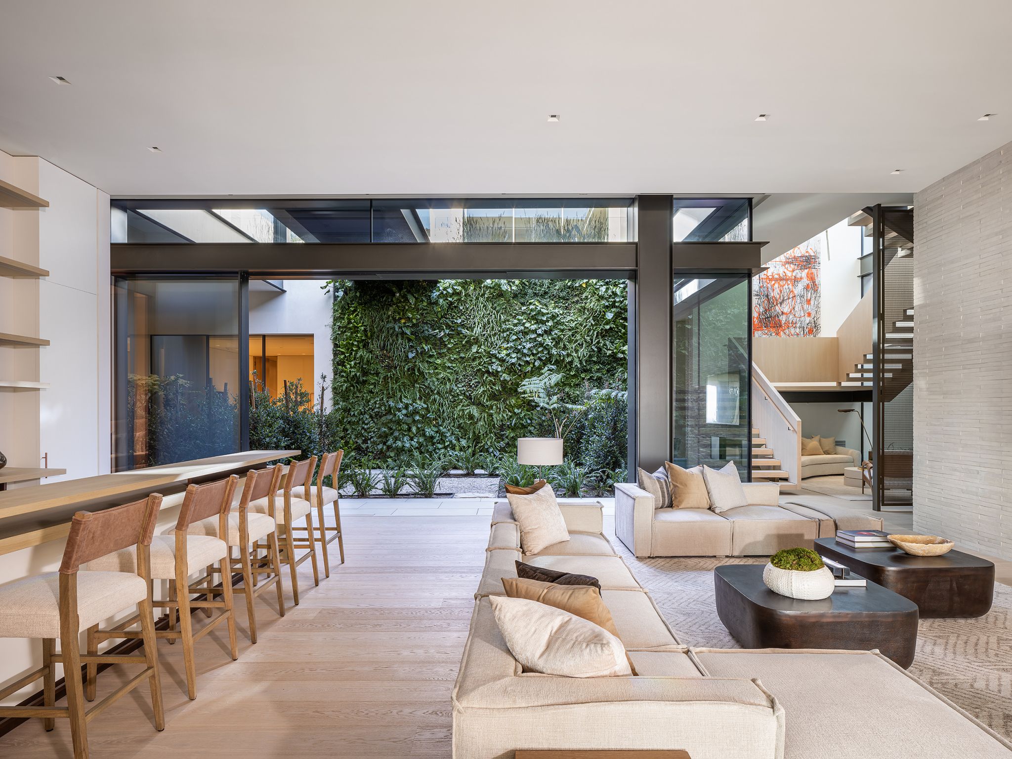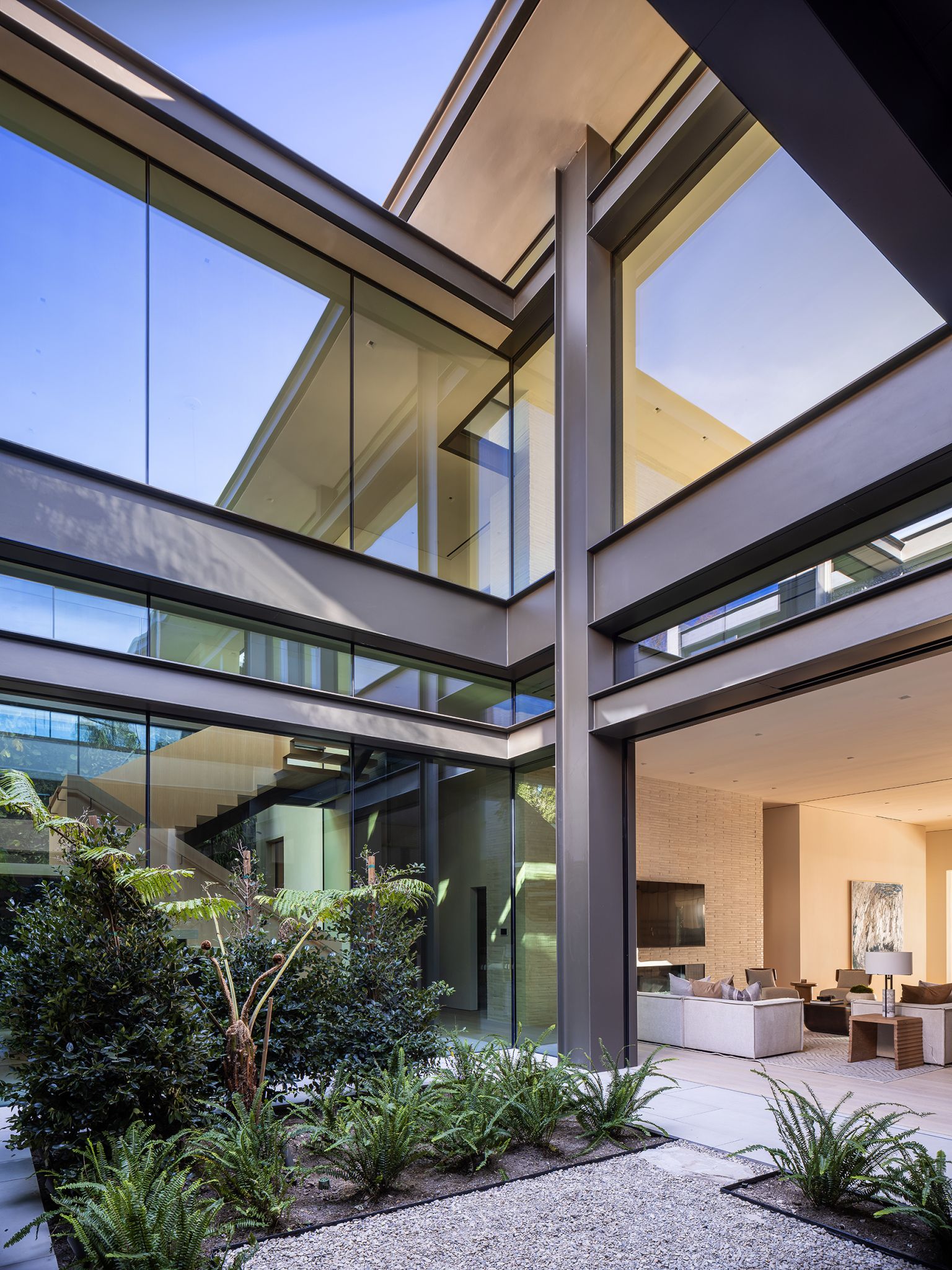 The central stair connects all levels of the home, enclosed in glass and surrounded by the vertical landscape of the courtyard. As one descends, the sound of the water wall and dense planting of the garden below come into focus. The lower-level courtyard forms the heart of this level, bringing in light and natural ventilation while creating privacy for the rooms that surround it.