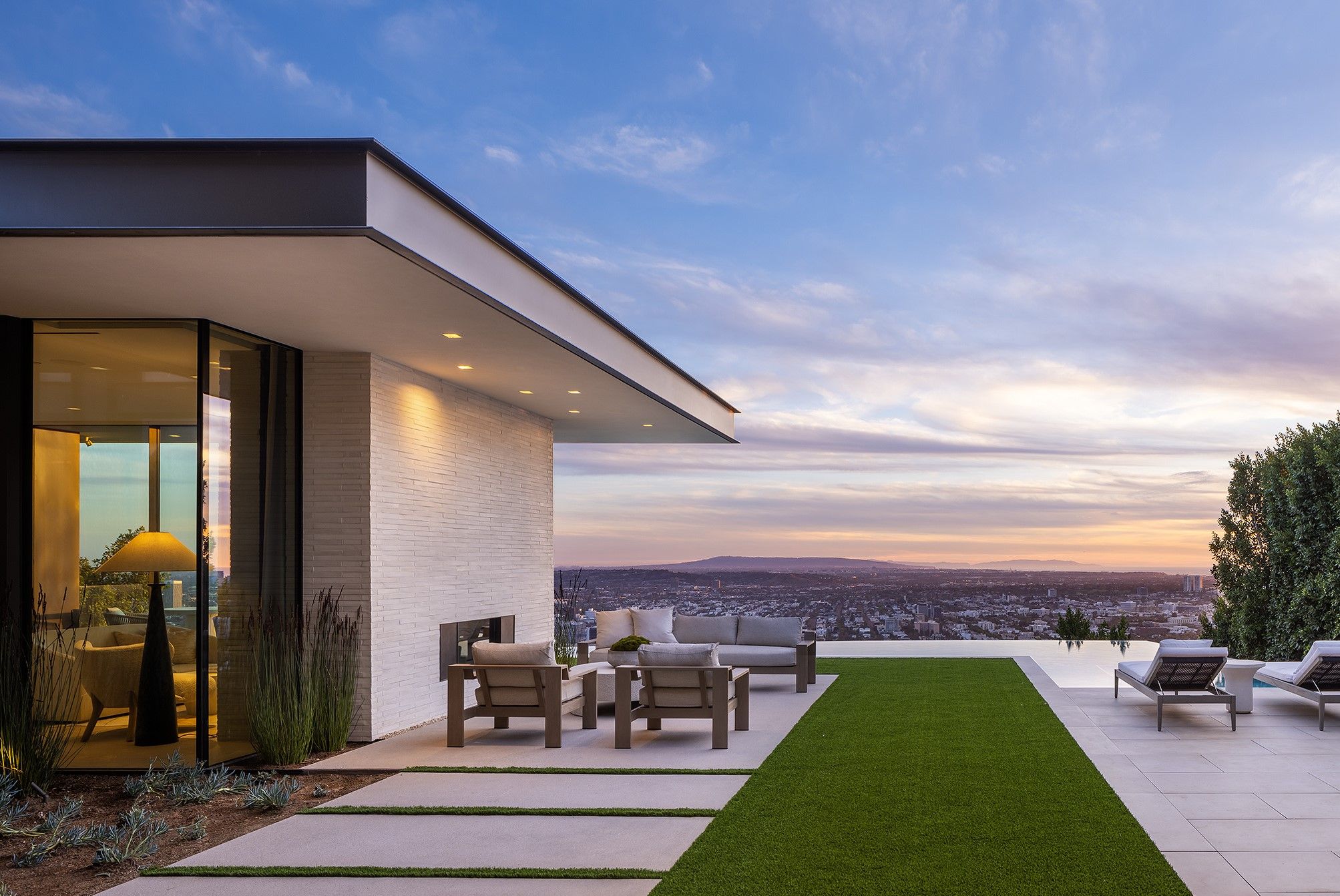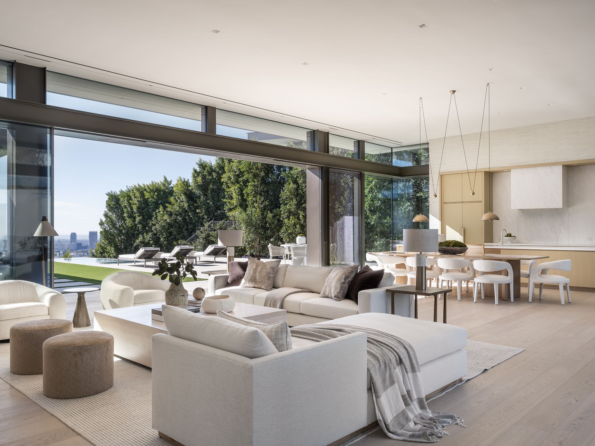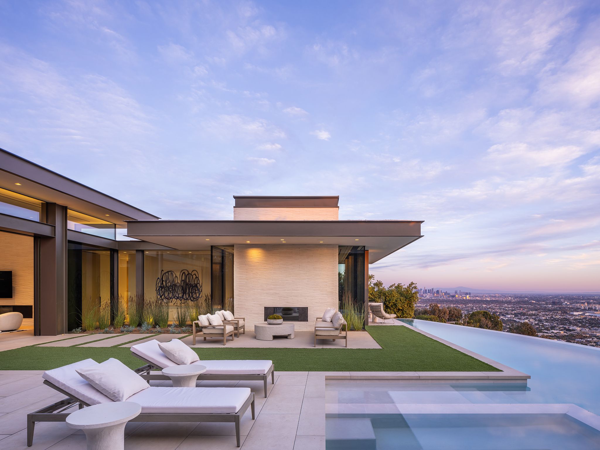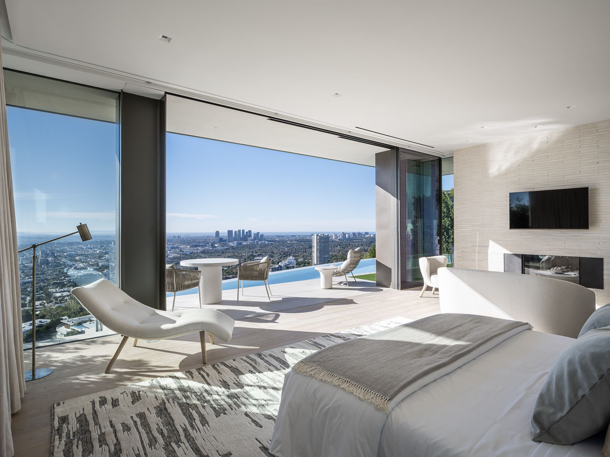 The primary suite is positioned at the far edge of the upper level, offering privacy and the most expansive vantage point. Large sliding glass doors open the bedroom directly to the pool terrace, creating a seamless connection between rest and view. Every element of the upper level is designed to maximize openness and the sense of being perched above the city.