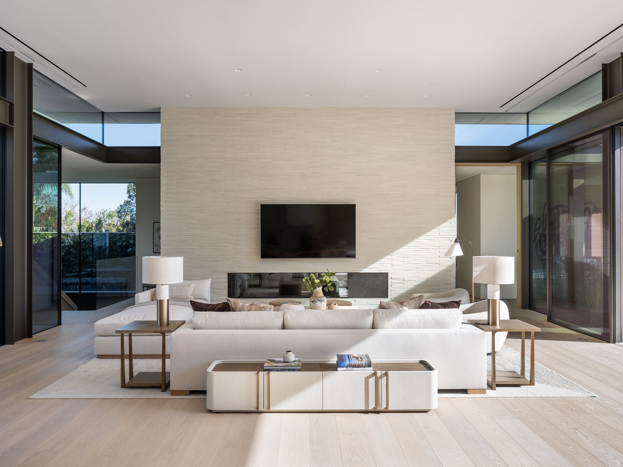 At the base of the stair is a generous entertainment space, complete with a bar and media lounge. Sliding glass walls retract to open the entire level to the courtyard garden, extending the living area outward. Two bedrooms on this level also open to the garden, reinforcing the idea of indoor-outdoor living. Toward the rear, the gym and an additional guest suite take full advantage of the home’s site, with direct access to an expansive terrace and uninterrupted city views beyond. The gym is fully glazed on both sides to allow natural light to flow across the plan and connect the spaces visually.