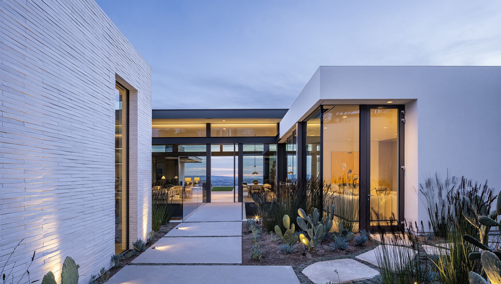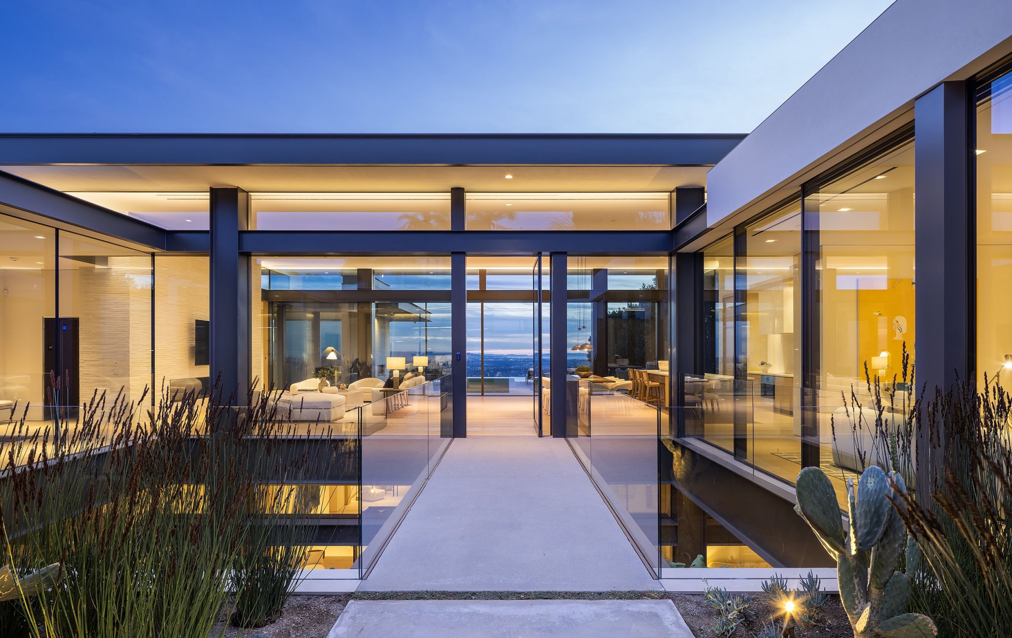 Arrival begins at the street, where parking and a pedestrian approach lead to a metal-screened gate. Passing through, one enters a quiet garden that sets the tone for the home—a space of calm and seclusion suspended above the city. The entry garden is shared by two guest bedrooms and a family room, which together frame the space and offer a preview of the layered architectural experience to come. The family room bridges over the courtyard below, allowing glimpses of the tropical landscape that awaits on the lower level.Crossing the garden, the entry threshold takes the form of a bridge, suspended above the lush courtyard and flanked by a glass-enclosed stair tower on one end and a water wall on the other. This transitional space opens directly into the great room, where living, dining, and kitchen areas are united in a single, open volume. The room orients entirely toward the view, with floor-to-ceiling glass opening to an infinity edge pool that stretches across the rear of the property. The pool blurs the boundary between interior and landscape, earth and sky.