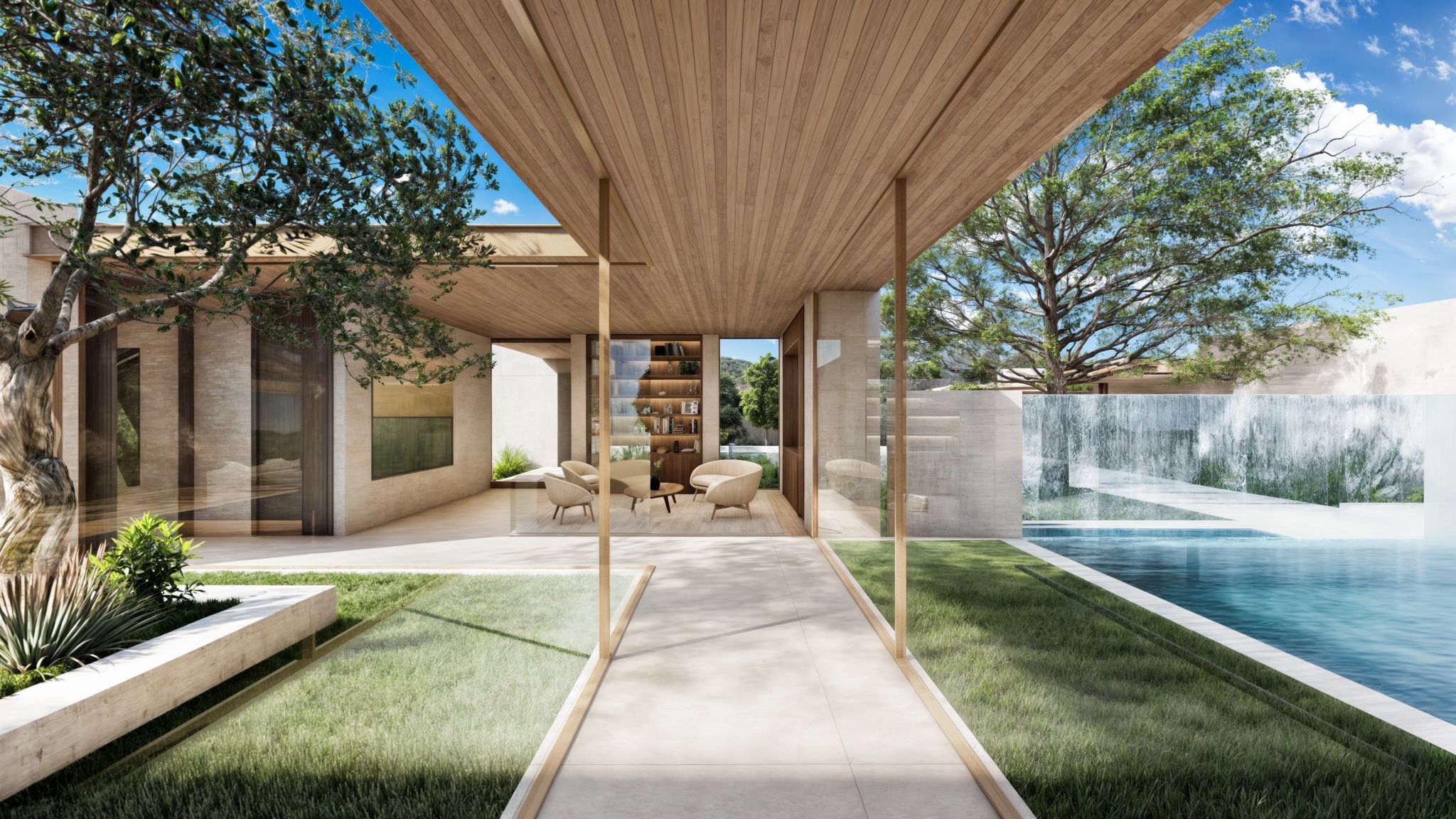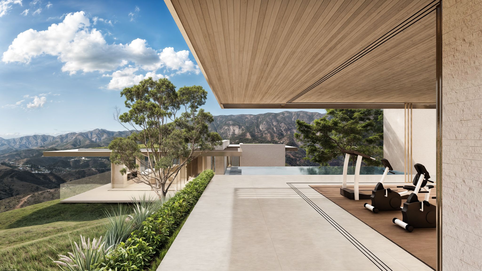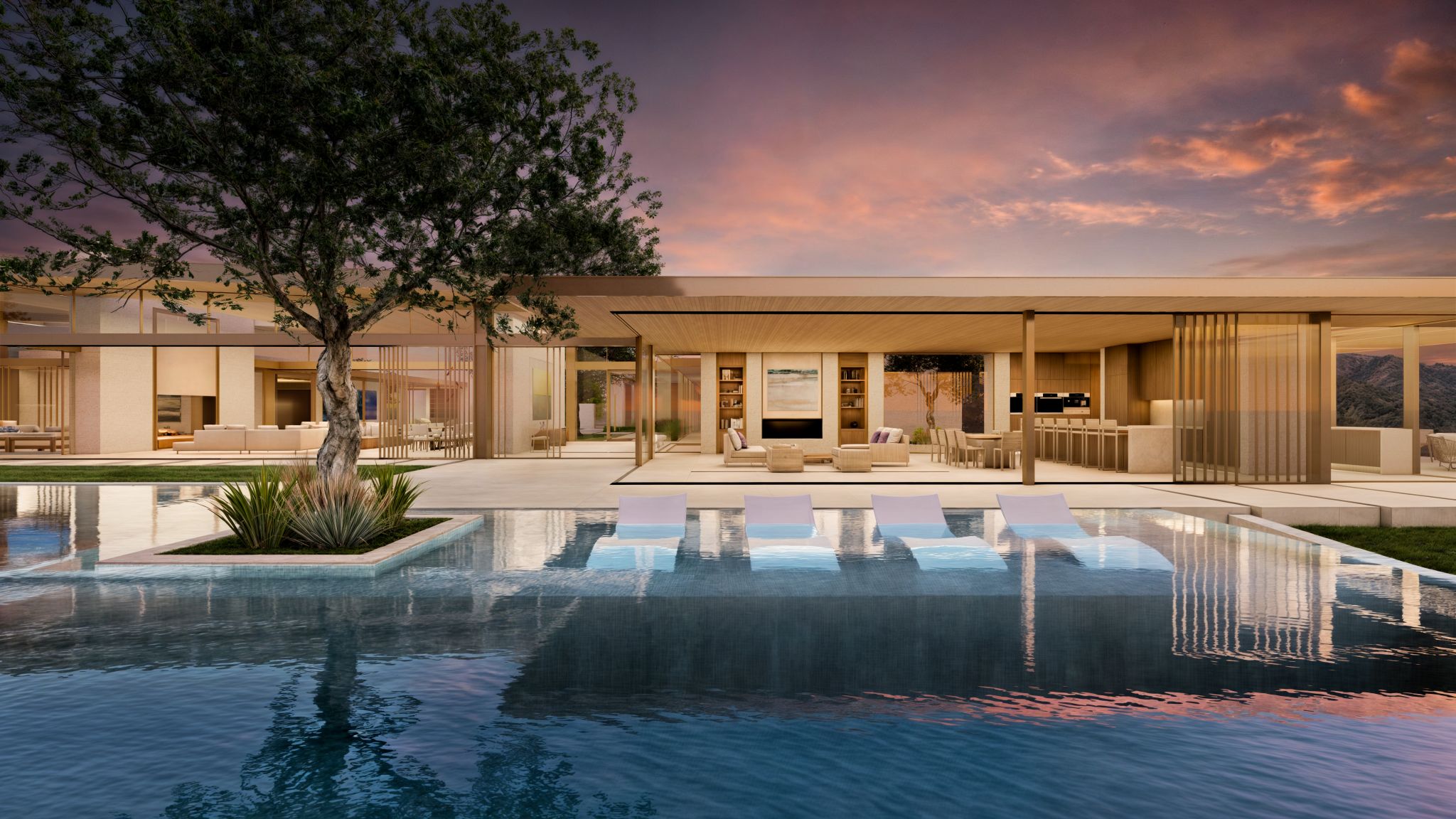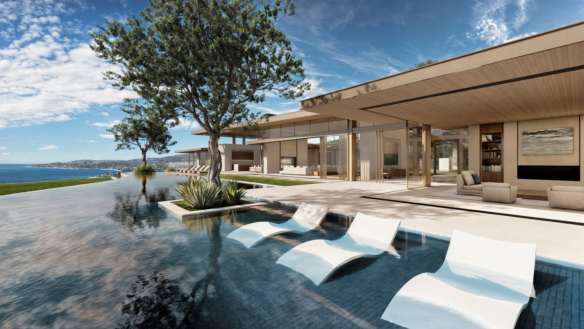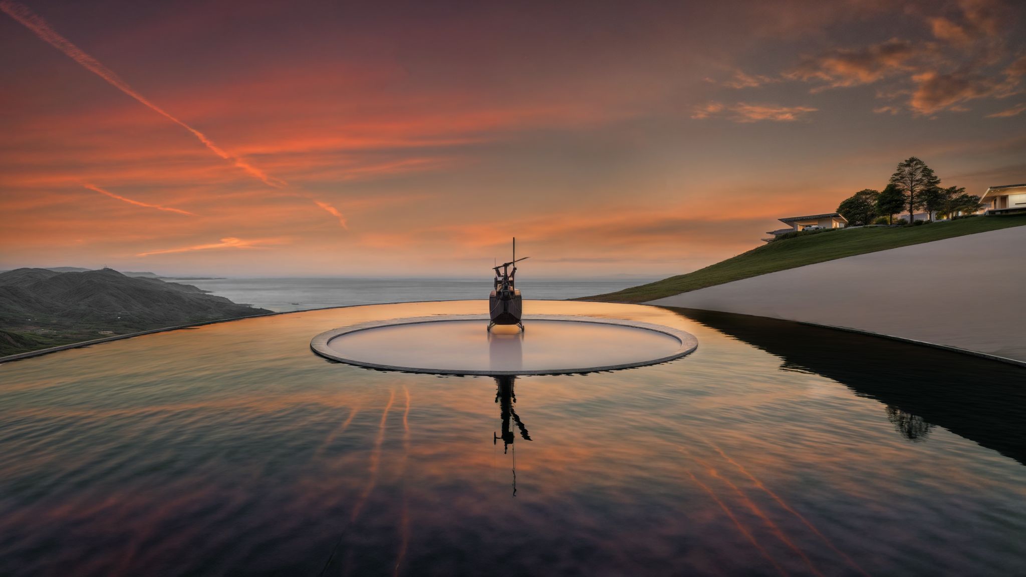 Each space within the home opens directly to outdoor terraces with unobstructed views. The main living space connects directly to the pool terrace with full height glazing that pockets into adjacent walls to create a seamless blend of indoor-outdoor living, while the pool itself contains planted islands with trees that frame the sunset. The estate also contains a wellness retreat, guest house, underground parking garage cars as well as a helicopter landing pad.