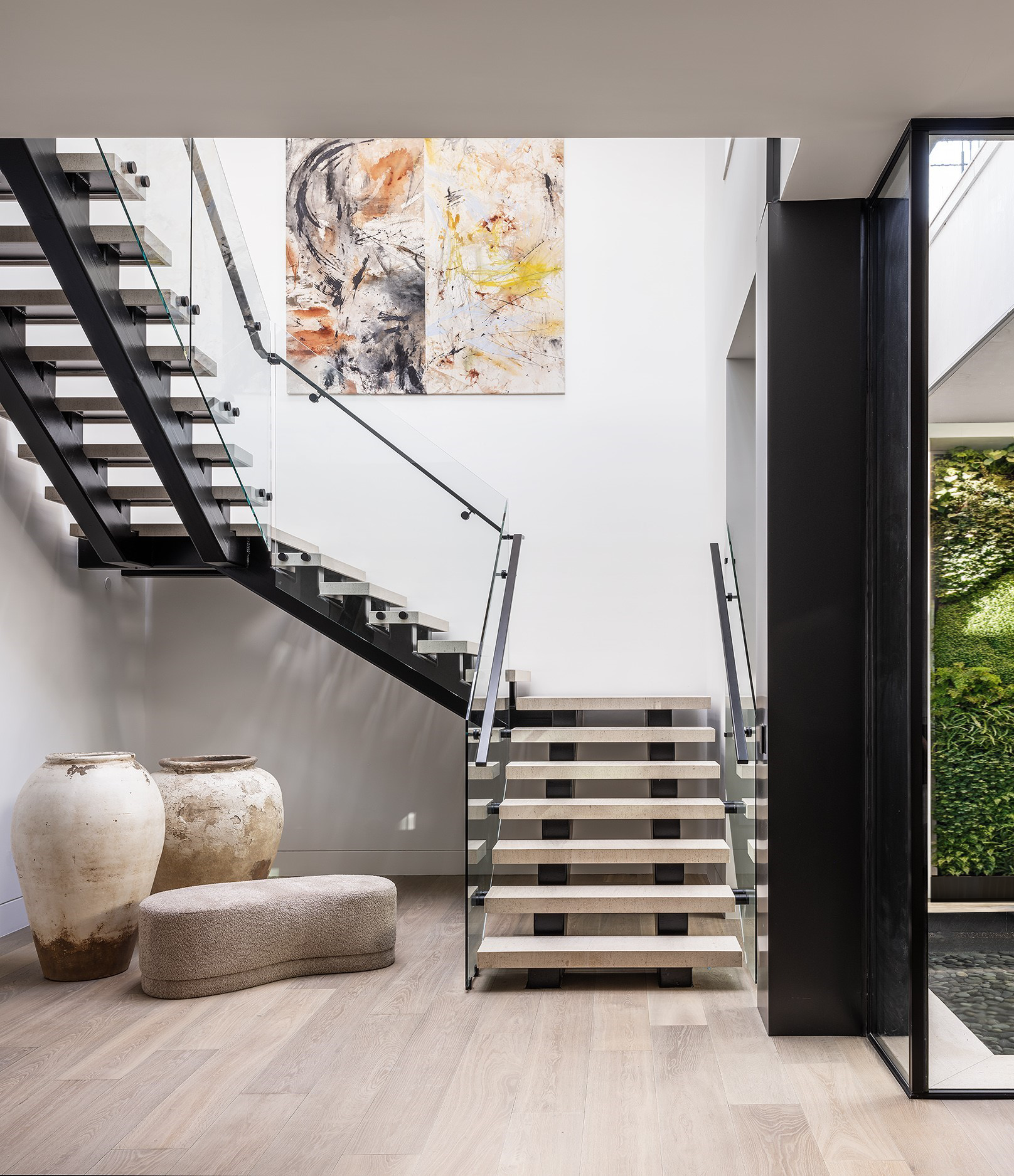 The home’s entry is subtly shielded from the street by a minimalist metal screen, which is visually balanced by dramatic stonework across the elevation. An intimate bridge and entry courtyard provide a sense of separation from the street while also channeling daylight into the basement. A sculptural, skylit stair adjacent to the entry serves as a vertical anchor, connecting the sky to the lower level and drawing light deep into the home’s core. This layered entry sequence creates a transition from public to private, enhancing the experience of arrival while setting the tone for the home’s emphasis on natural light and spatial clarity.