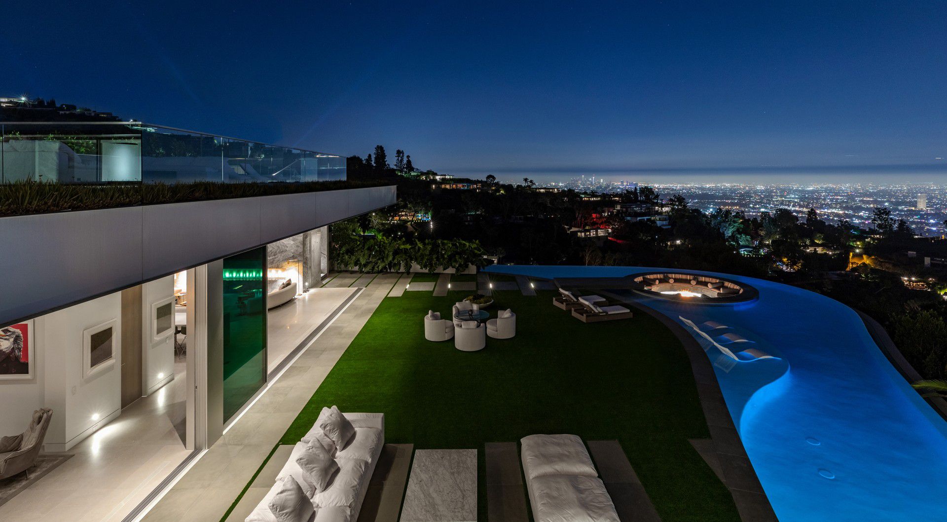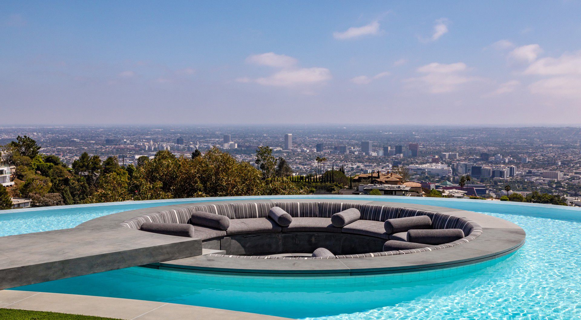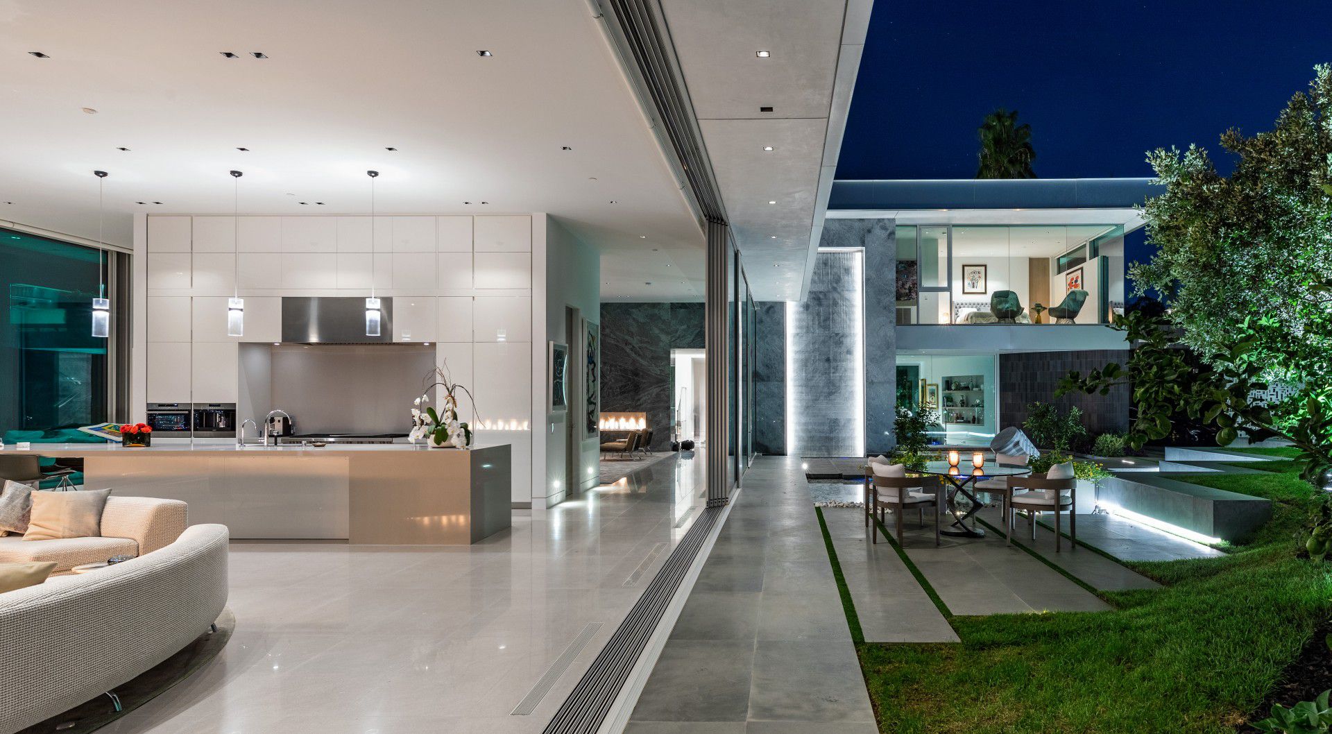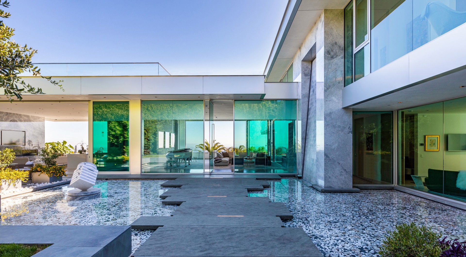 High above Sunset Boulevard, the Robin Drive house was built on a 28,033-square-foot lot in a fairly dense area with large homes located quite close to each other. The architect says that the biggest challenge of the project was “essentially how to fit a three-story house into a one-story community.” The main level was dropped by eight feet to allow for the increase in floor area and keep the entire house within the required sixteen-foot height. The entry has a basalt rotunda that separates the house from the street and a two-story water wall spilling into a water garden, as well as an infinity edge swimming pool facing spectacular views of the city. The form of the pool is generated by the site contours and the maximum height allowed above grade and it is pushed to the extremities of the lot to increase the buildable area, as well as the garden spaces. The upper level is rotated ninety degrees as compared to the main floor in order to decrease visibility from the street and allowing the creation of a rooftop deck on the otherwise green roof. The master bedroom is cantilevered above the garden, creating a covered patio space below. The architect states, “The concept for living spaces is a glass pavilion with minimal walls, allowing a direct visual connection between the entry water garden and the pool beyond.” The basement garage area includes a car display space, a bar, a golf simulation room, and a cigar patio. It also houses a media room, a lounge, a gym, staff quarters, and a kitchen, as well as a wellness area with a float tank and hydro-tub. Exteriors and interior walls of the house are in Bardiglio marble. Black basalt is also employed inside. Quartzite and oak as well as Palladio gray sandstone are also part of the interior material palette.