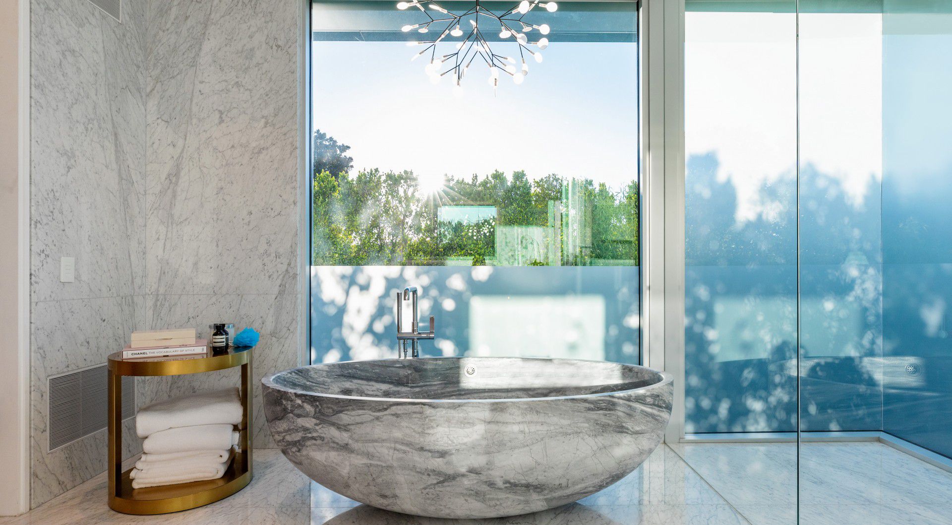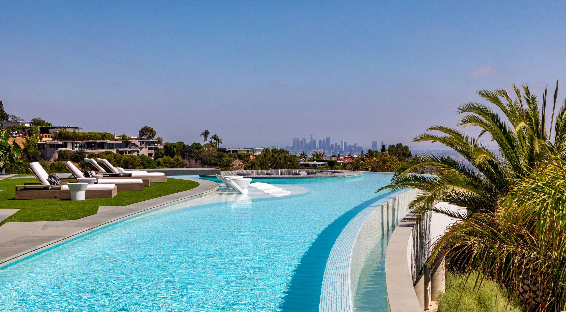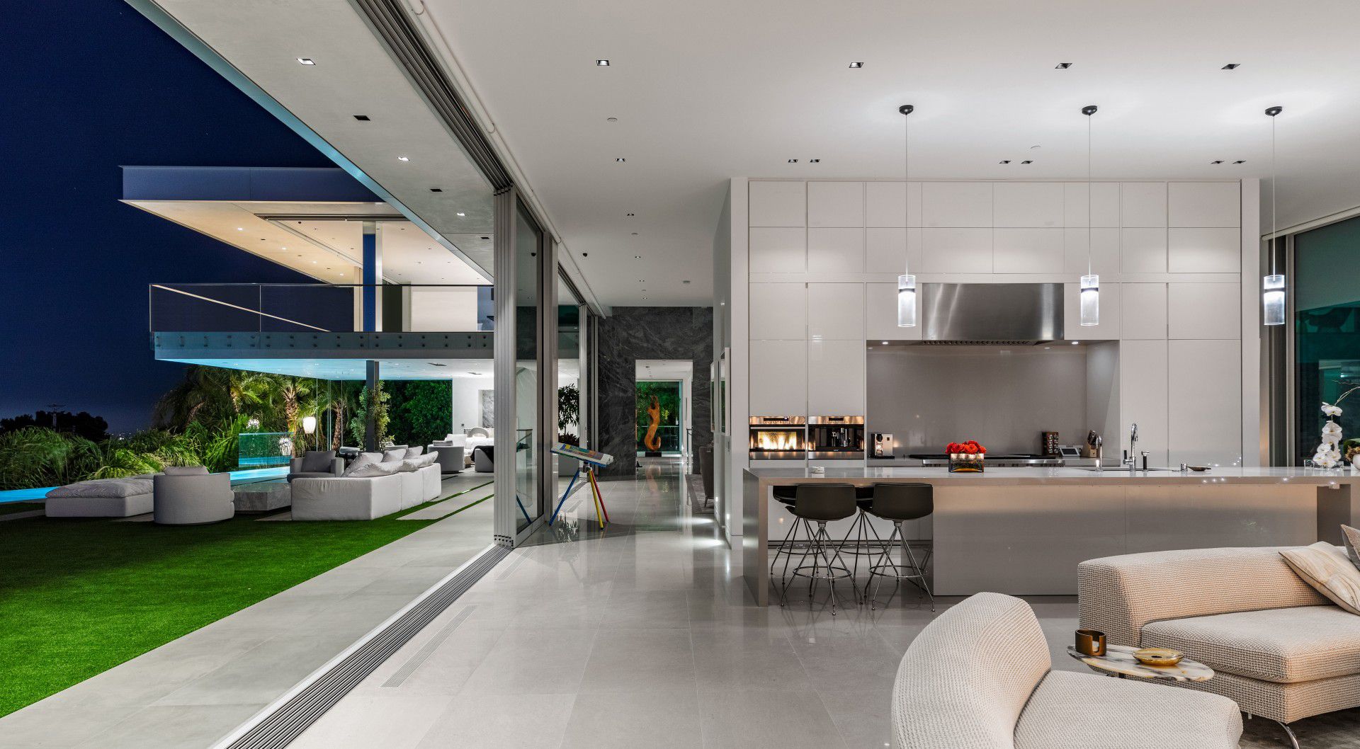 High above Sunset Boulevard, the Robin Drive house was built on a 28,033-square-foot lot in a fairly dense area with large homes located quite close to each other. The architect says that the biggest challenge of the project was “essentially how to fit a three-story house into a one-story community.” The main level was dropped by eight feet to allow for the increase in floor area and keep the entire house within the required sixteen-foot height. The entry has a basalt rotunda that separates the house from the street and a two-story water wall spilling into a water garden, as well as an infinity edge swimming pool facing spectacular views of the city. The form of the pool is generated by the site contours and the maximum height allowed above grade and it is pushed to the extremities of the lot to increase the buildable area, as well as the garden spaces. The upper level is rotated ninety degrees as compared to the main floor in order to decrease visibility from the street and allowing the creation of a rooftop deck on the otherwise green roof. The master bedroom is cantilevered above the garden, creating a covered patio space below. The architect states, “The concept for living spaces is a glass pavilion with minimal walls, allowing a direct visual connection between the entry water garden and the pool beyond.” The basement garage area includes a car display space, a bar, a golf simulation room, and a cigar patio. It also houses a media room, a lounge, a gym, staff quarters, and a kitchen, as well as a wellness area with a float tank and hydro-tub. Exteriors and interior walls of the house are in Bardiglio marble. Black basalt is also employed inside. Quartzite and oak as well as Palladio gray sandstone are also part of the interior material palette.