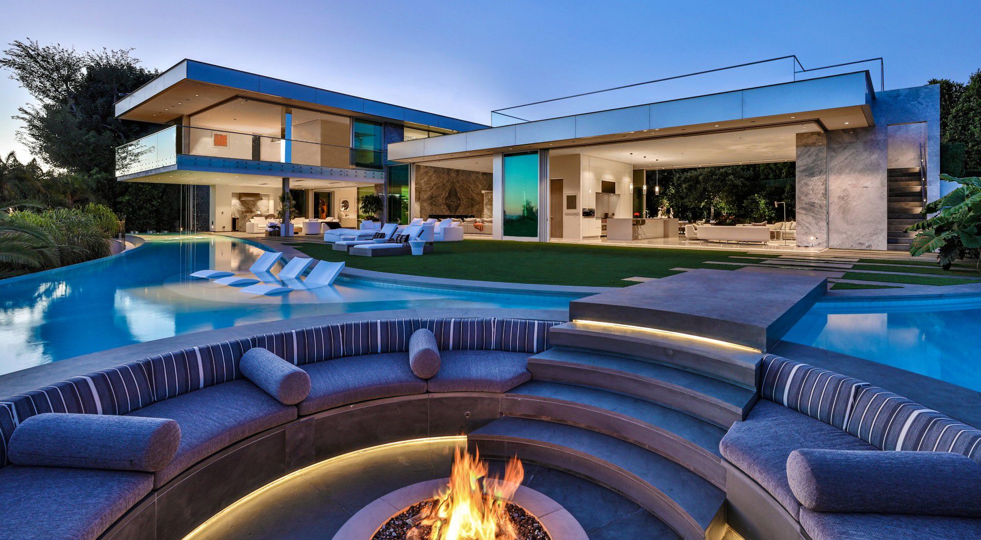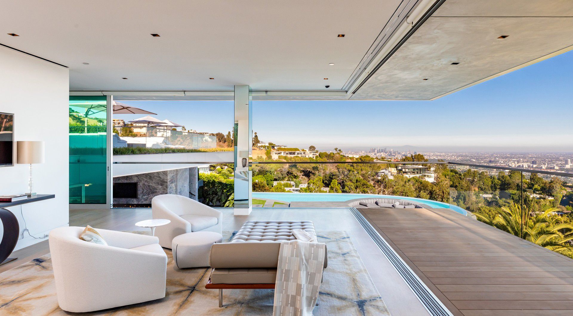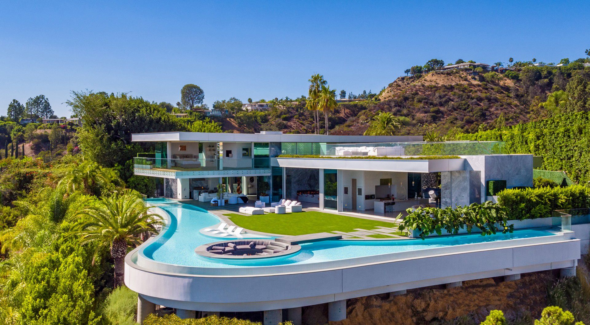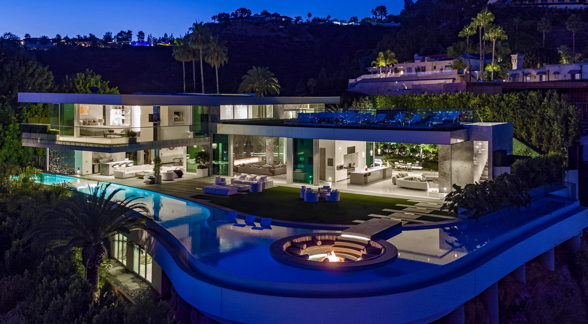 High above Sunset Boulevard, the Robin Drive house was built on a 28,033-square-foot lot in a fairly dense area with large homes located quite close to each other. The architect says that the biggest challenge of the project was “essentially how to fit a three-story house into a one-story community.” The main level was dropped by eight feet to allow for the increase in floor area and keep the entire house within the required sixteen-foot height. The entry has a basalt rotunda that separates the house from the street and a two-story water wall spilling into a water garden, as well as an infinity edge swimming pool facing spectacular views of the city. The form of the pool is generated by the site contours and the maximum height allowed above grade and it is pushed to the extremities of the lot to increase the buildable area, as well as the garden spaces. The upper level is rotated ninety degrees as compared to the main floor in order to decrease visibility from the street and allowing the creation of a rooftop deck on the otherwise green roof. The master bedroom is cantilevered above the garden, creating a covered patio space below. The architect states, “The concept for living spaces is a glass pavilion with minimal walls, allowing a direct visual connection between the entry water garden and the pool beyond.” The basement garage area includes a car display space, a bar, a golf simulation room, and a cigar patio. It also houses a media room, a lounge, a gym, staff quarters, and a kitchen, as well as a wellness area with a float tank and hydro-tub. Exteriors and interior walls of the house are in Bardiglio marble. Black basalt is also employed inside. Quartzite and oak as well as Palladio gray sandstone are also part of the interior material palette.
