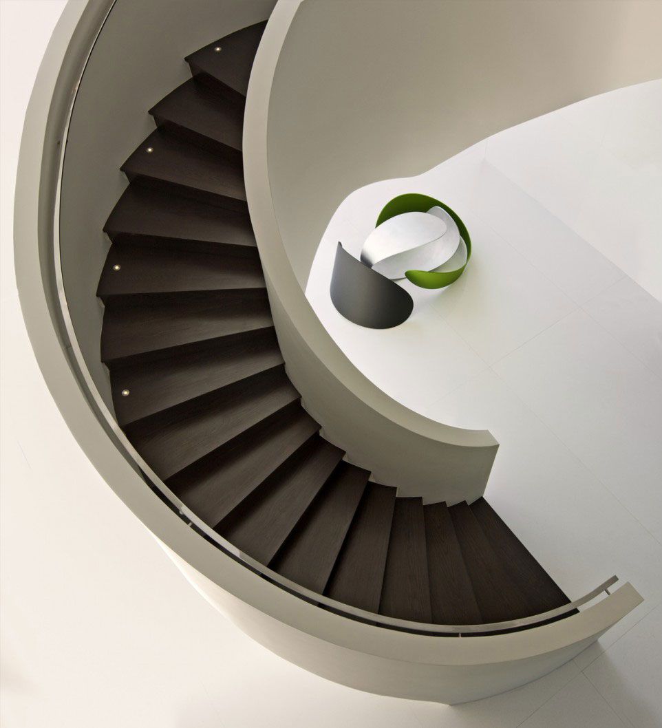 The house is approached by means of an expansive planted circular vehicle court. The home is oriented to the north-east with a four car garage nestled below a terraced garden above. Lower level includes entry foyer, living room, spiral staircase hall, library/office, dining room facing wine storage room, kitchen/family room, media room, pantry, maid’s quarters, split-level laundry, and two powder rooms. Upper level consists of master suite including his and hers closets and baths as well as an office, three bedrooms with full baths, gym, and guest suite with bedroom, living room, and full bath. A favorite feature of this home is the stair hall’s ultra-modern crisp white spiral staircase treaded in charcoal-toned wood, ascending to the upper level in its own unique space.