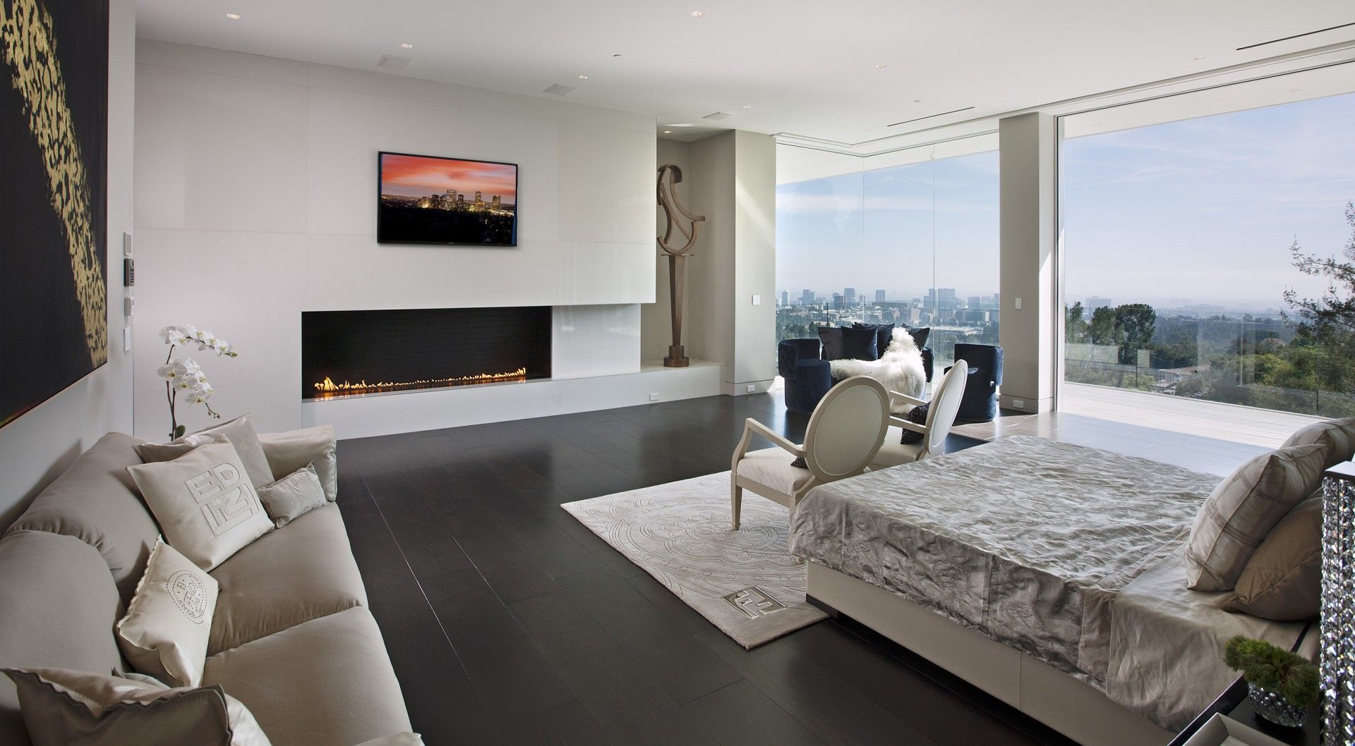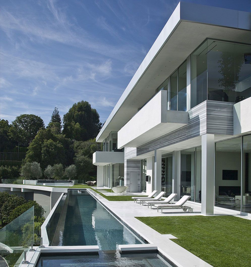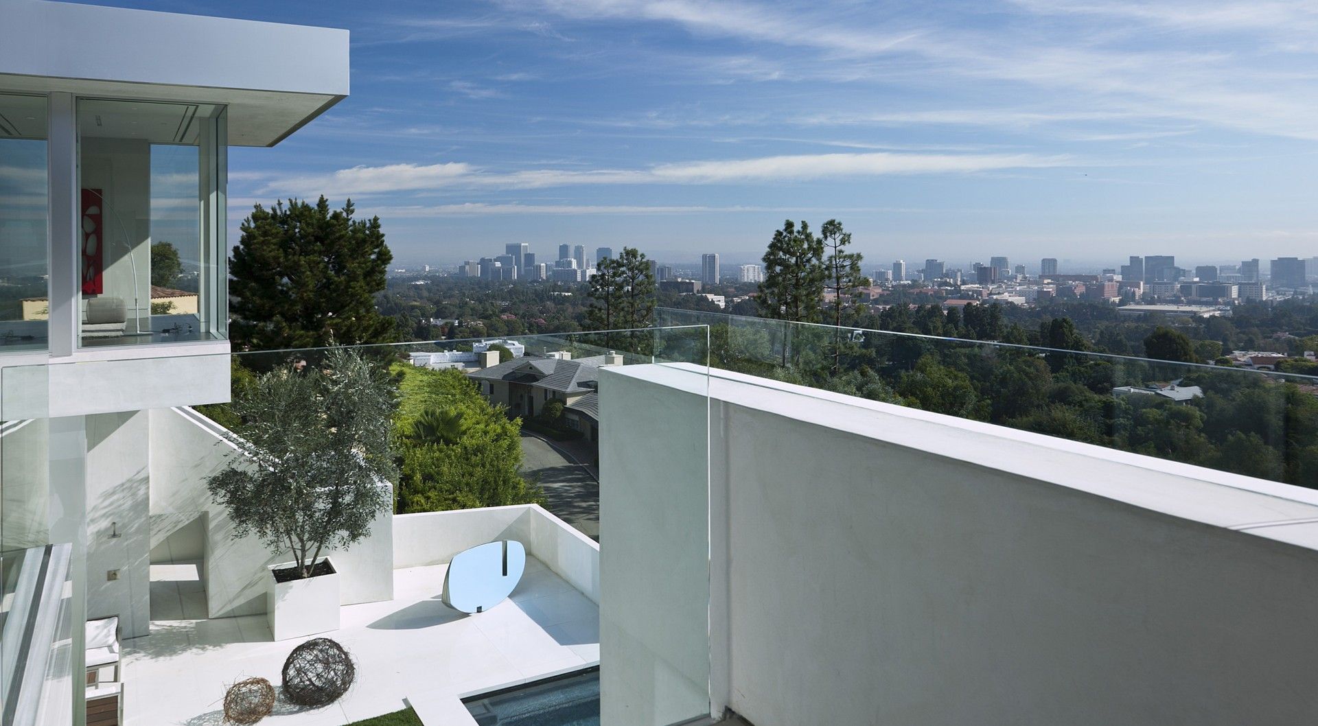 Adequate tailored outdoor spaces were paramount to the design. The tight hillside lot proved a challenge but was successfully resolved by elevating most of the flat outdoor areas on caissons. An open green lawn to one side of the home rests above the two-car garage; the space is completed by a built-in seating area, with a linear fire pit, flanked by olive trees that forms a beautiful spot to admire the striking city views. Along the southern façade, the polished white-colored stone from the interior is carried outside to form an expansive deck. Beyond the deck, an over long infinity lap pool frames the view and contains a seemingly floating fire feature which just adds to the drama. The result is a modern urban haven that “floats” above the city below.