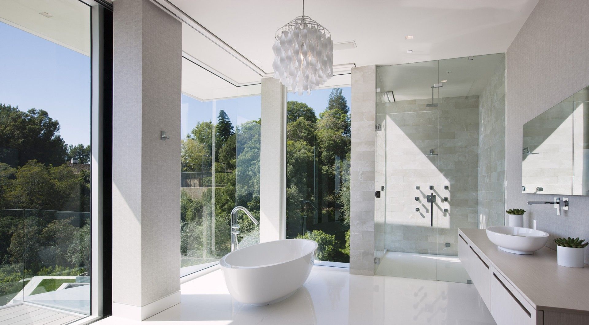 Having adequate tailored outdoor spaces was paramount to the design. The tight hillside lot proved a challenge but was successfully resolved by elevating most of the flat outdoor areas on caissons. An open green lawn to one side of the home rests above the two-car garage. A built-in seating area completes with a linear fire pit and flanked by olive trees forms a beautiful spot admire the striking city views. Along the southern façade, the polished white-colored stone from the interior is carried outside to form an expansive deck. Beyond the deck, an over long infinity lap pool frames the view and contains a seemingly floating fire feature which just adds to the drama. The result is a modern urban haven that “floats” above the city below.