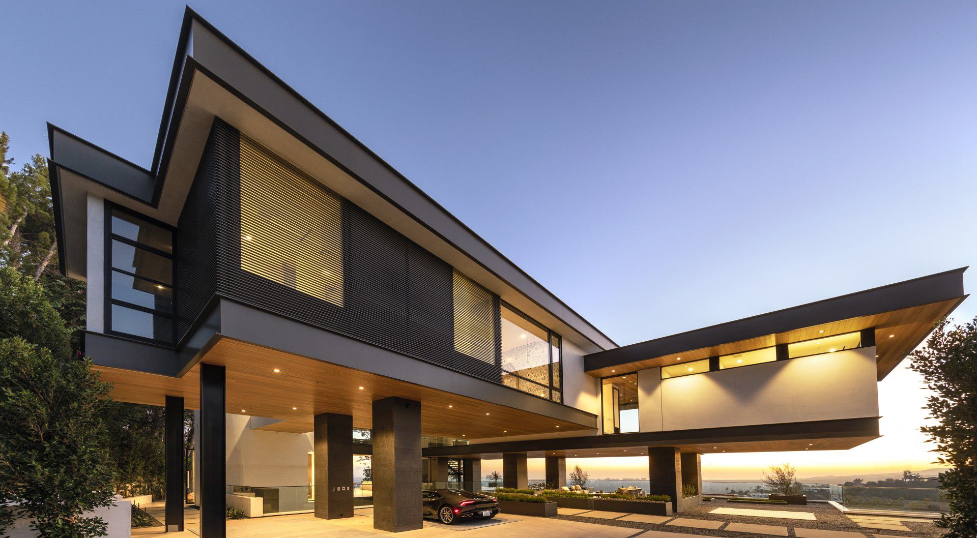 Located in West Hollywood on Skylark Lane, this house was built on a steep 30,744-square-foot lot at the end of a narrow private street. The first impression that visitors have of the house is one of openness, with the second level appearing to float over the entry terrace and parking area, revealing views toward the ocean and the west side of Los Angeles.