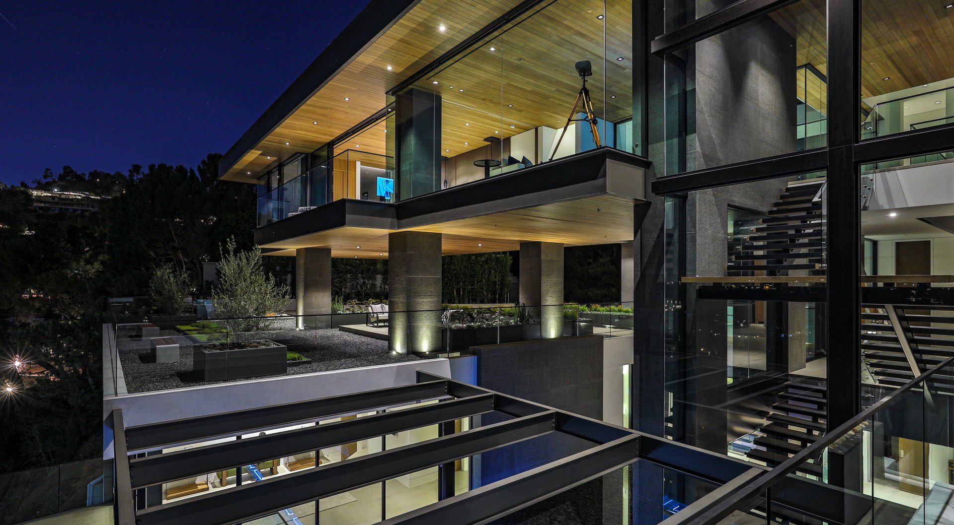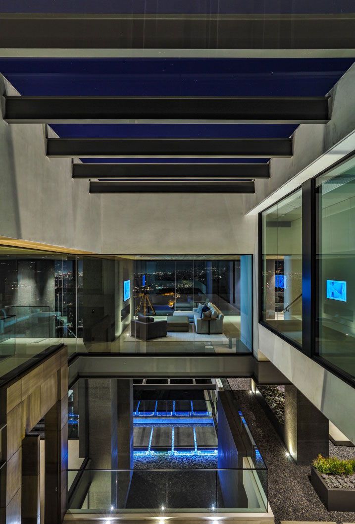 At the upper level two additional bridge components link the bedrooms to the two-story living room and loft. These spaces are the focal point of the house and have large tilting glass walls that lift up to become canopies over the terrace. These glass walls make the inside and outside decks of the house into a continuous living space. The architect explains that the house “has a somewhat industrial feel, exposed wide flange steel columns and fascia detailing, for example.” There are five bedrooms, living and family spaces, a gym, a media room, and two offices. The main level of the house, which is about half the size of the basement or the upper floor, houses the living, dining, and kitchen areas together with large terraces.